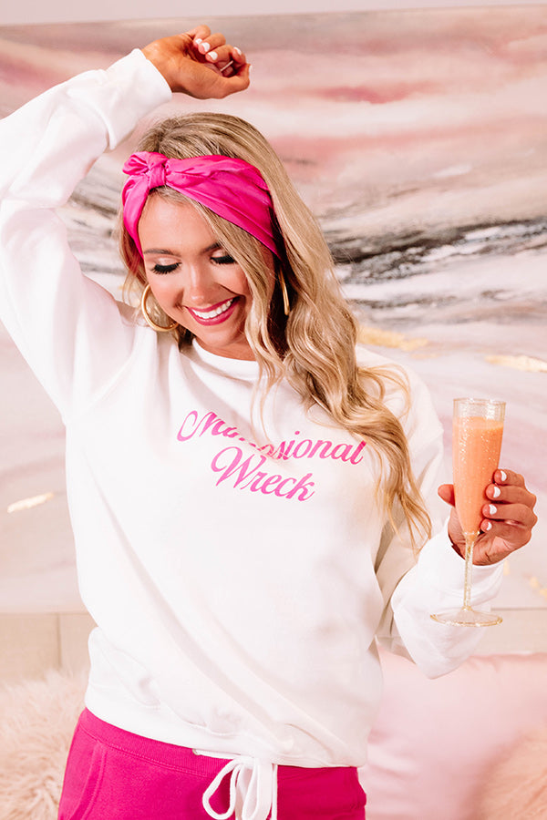 Stay looking put together in our cute white "Mimosional Wreck Sweatshirt" featuring soft lightweight material with pink cursive lettering on the front, a high rounded neckline, long loose sleeves, and a relaxed silhouette that falls into a straight hemline! We have styled this trendy piece with some matching joggers and an accent headband, but you can also wear it with some distressed ankle skinnies, the "Steve Madden Phillip Leopard Sneaker," and our "London Bridge Leopard Tote in Black!"