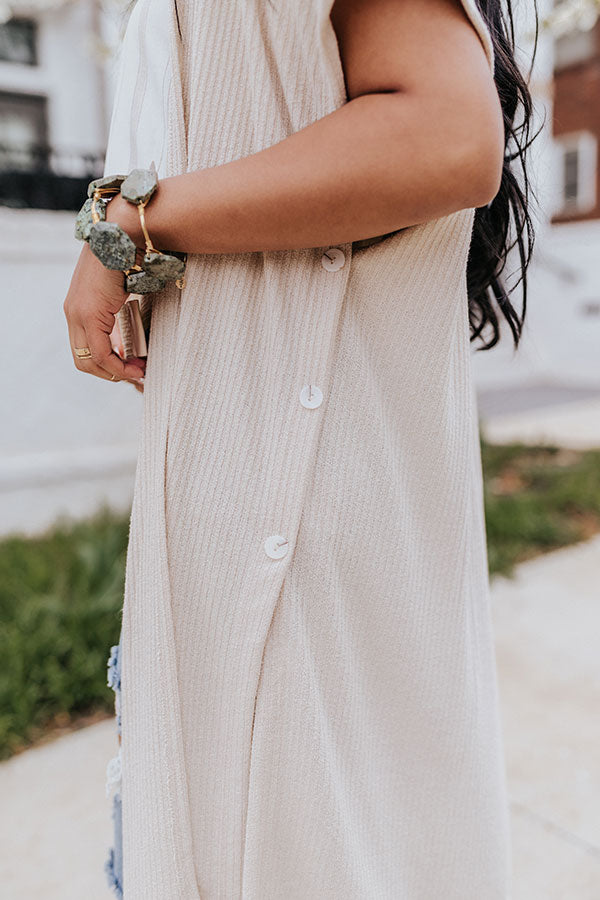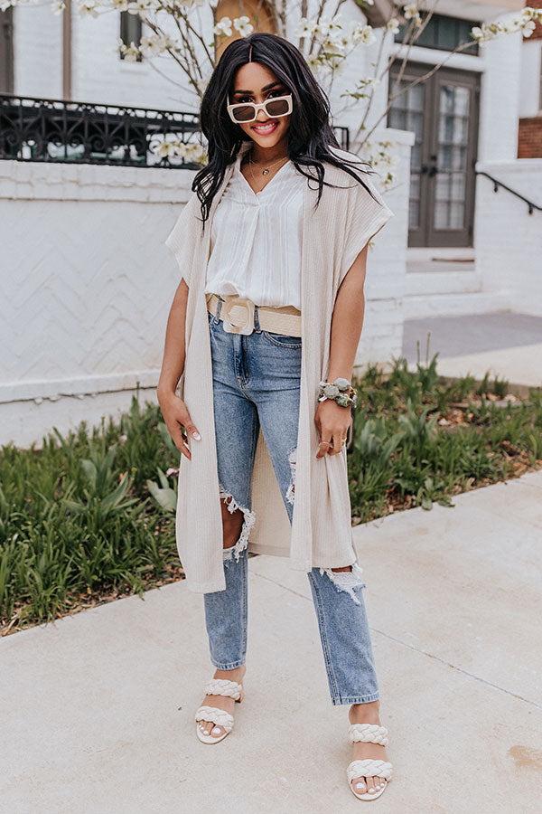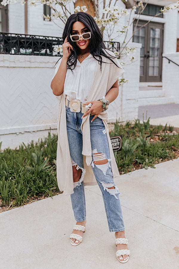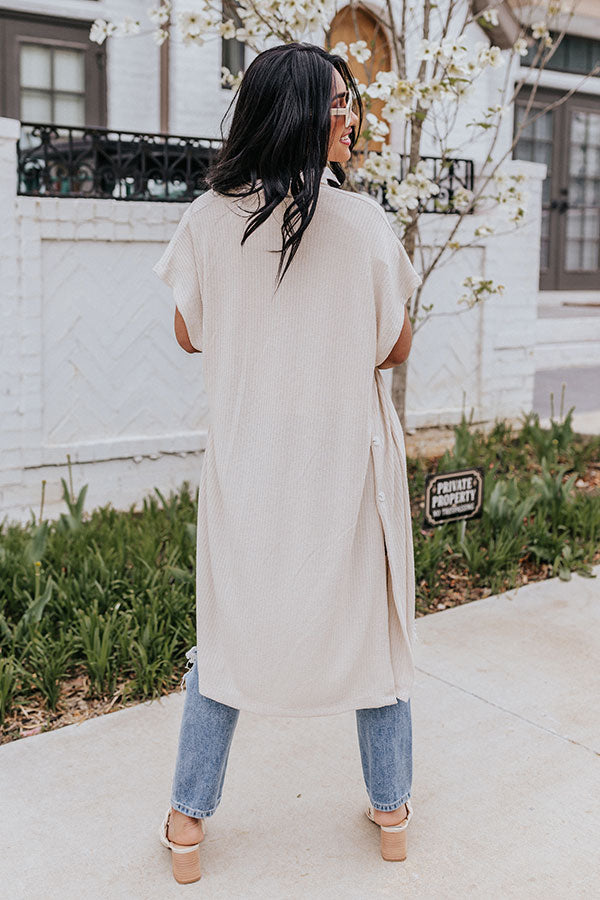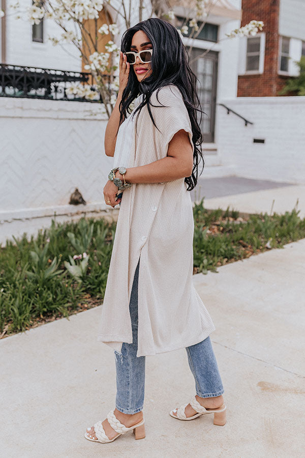 Who says you can't wear layers in the warmer months? Our birch hued 'Mind On Miami' is the perfect summer overlay with its soft lightweight and flowy tight knit material, short sleeves, and ultra draped open front silhouette that cascades into a straight mid-calf length hemline with accent side slits! Measurements