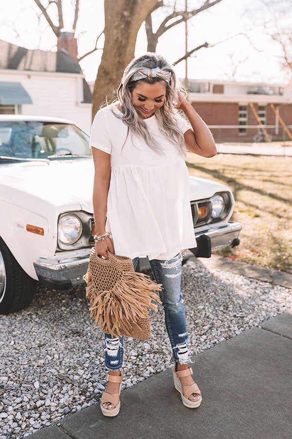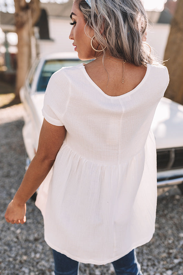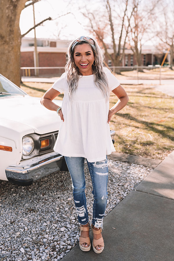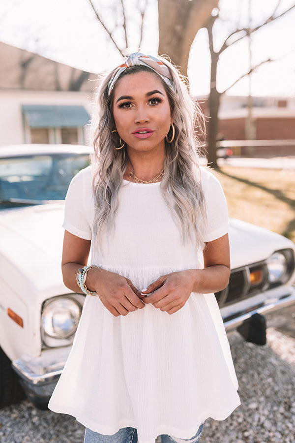 Stay causal but classy in our simple white 'Mind Over Mimosas' top featuring lightweight flowy material, a high neckline, short loose sleeves, and a flattering babydoll silhouette that falls into a straight tunic-length hemline! Measurements