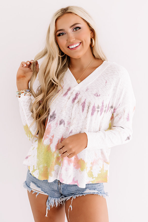 There is no better piece to spend a cozy morning in than this adorable white hoodie featuring soft lightweight material patterned with colorful tie dye, a v-cut neckline with a hooded back that can be worn off one shoulder, long loose sleeves, and a relaxed silhouette that falls into a rounded hemline that can be knotted! This piece styles perfectly with some distressed denim shorts, trendy sneakers, and a faux leather backpack, or it can be worn with our "Ideal Comfort Joggers in Blush," our "Relaxing Poolside Sunnies in Purple," and "The Lyla Saldal in Gold!" Measurements