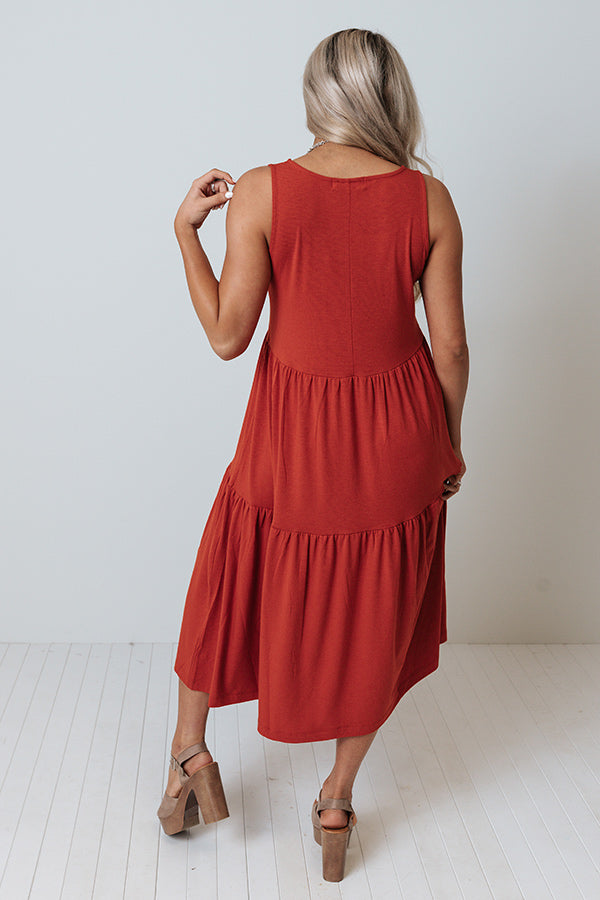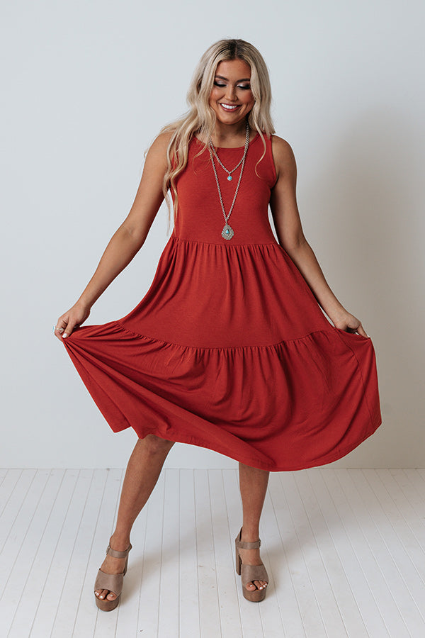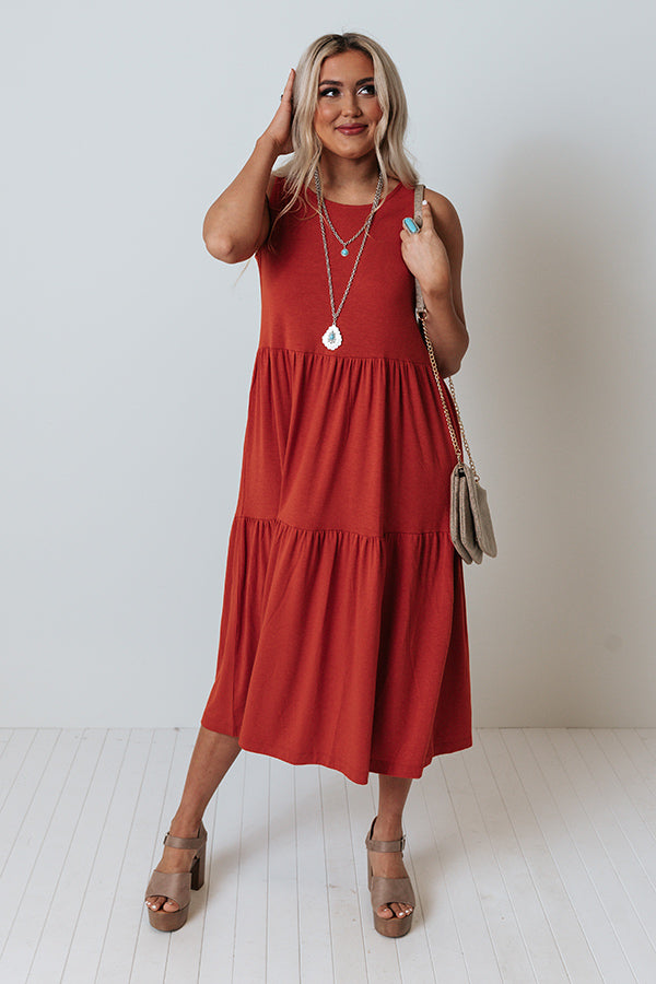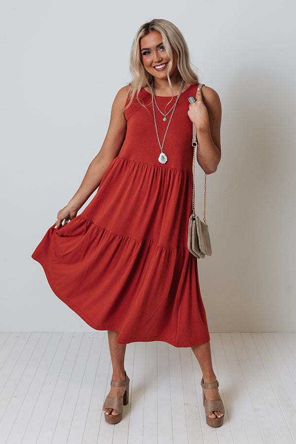 Yo won't find a more versatile year-round piece than our casual but cute rust colored 'Mindfulness Midi Dress' featuring soft and lightweight flowy material, a scooped neckline with wide sleeveless shoulder straps, and an ultra relaxed tiered silhouette that cascades into a straight mid-calf length hemline! Measurements