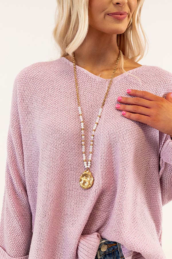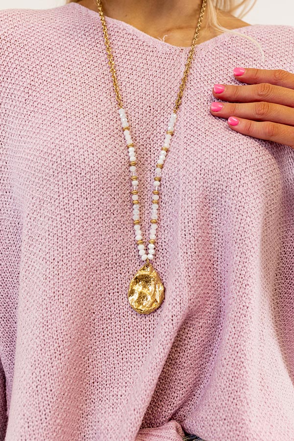 - Gold chain with shimmering white colored beads and gold teardrop pendant centerpiece