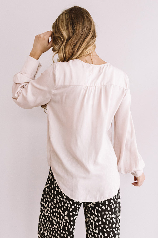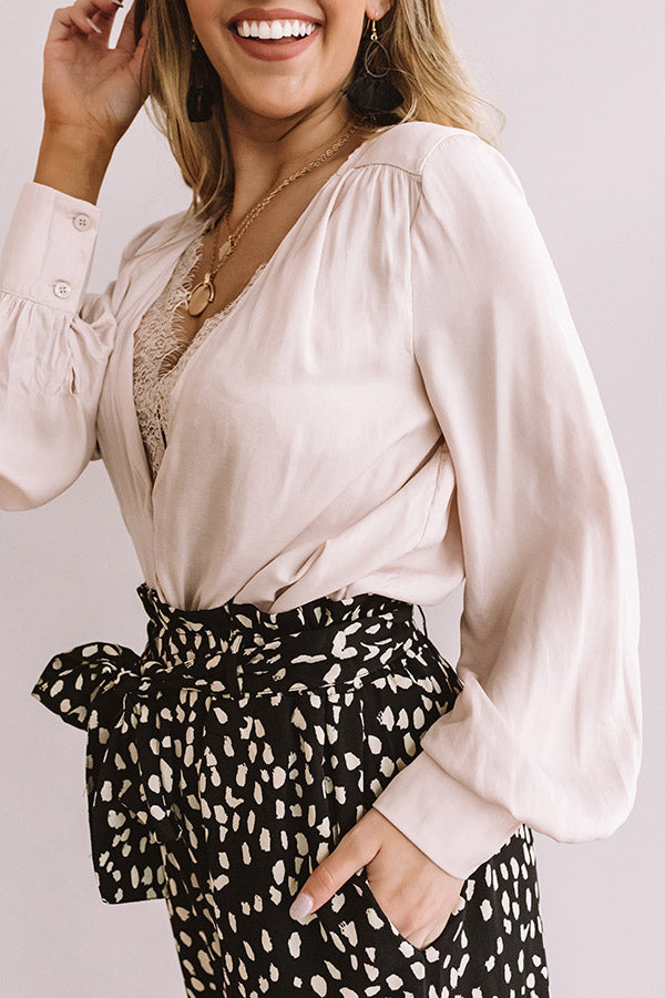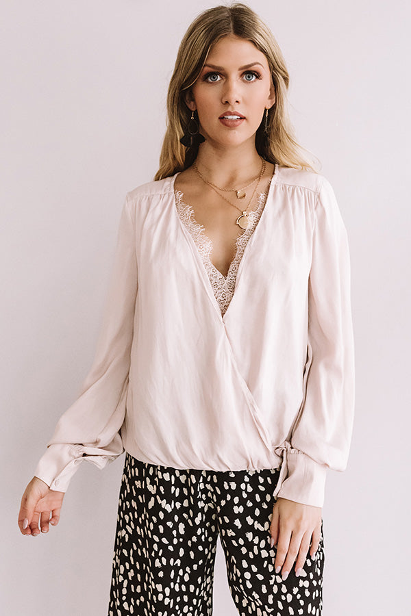 "Mirror, mirror on the wall," who is the chicest of them all? Of course it will be you when you wear this light blush colored top featuring lightweight silky material, a deep v-cut neckline with underlying lace trim detailing, long oversized bishop sleeves with wide button closure cuffs, and a wrapped silhouette that falls into a rounded hemline! You can dress this piece up for the workday by tucking it into some black and white spotted trousers with neutral heels and a black tote, or you can pair it with some distressed ankle skinnies, a faux suede hat, and "The Underwood Faux Leather Wedge in Natural" for a casual girls night out look! Measurements