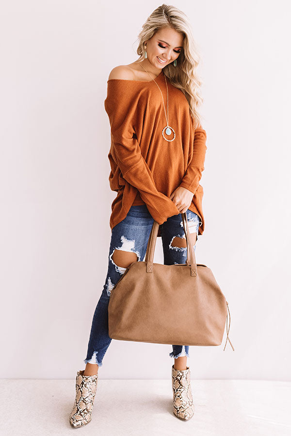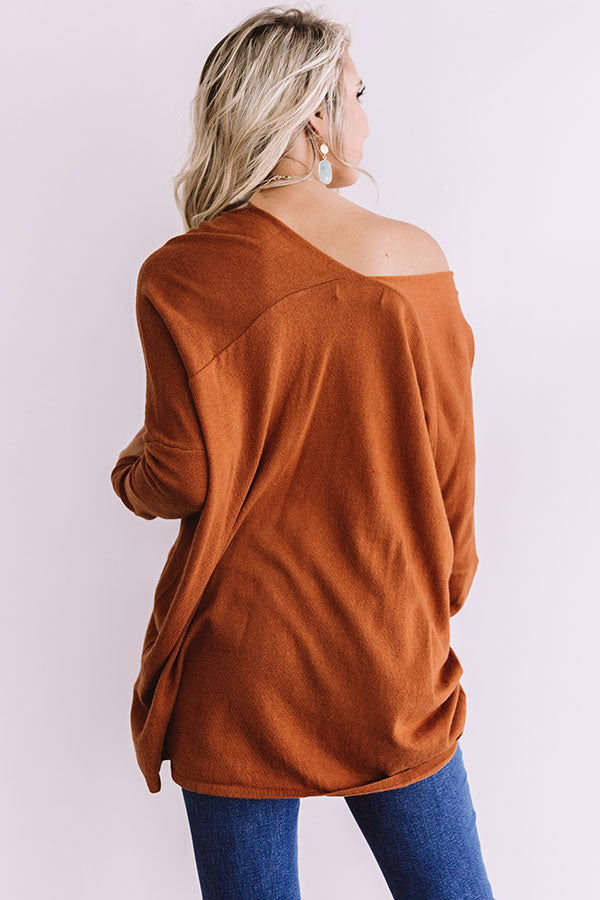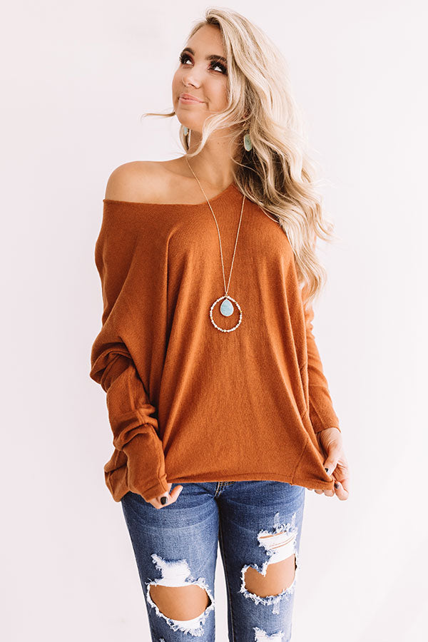 Bye warm weather...we'll miss you, maybe! Take in the beauty of the season while donning all your favorite hues in this cinnamon cotton sweater with its a relaxed v-cut neckline that can easily be taken off one shoulder, long fitted sleeves, and a relaxed bodice with a rounded high-low hem! This cozy transitional piece can be styled with frayed shorts, a crossbody, and neutral wedges for the summer or distressed pants, a tote, and booties for the fall! Measurements