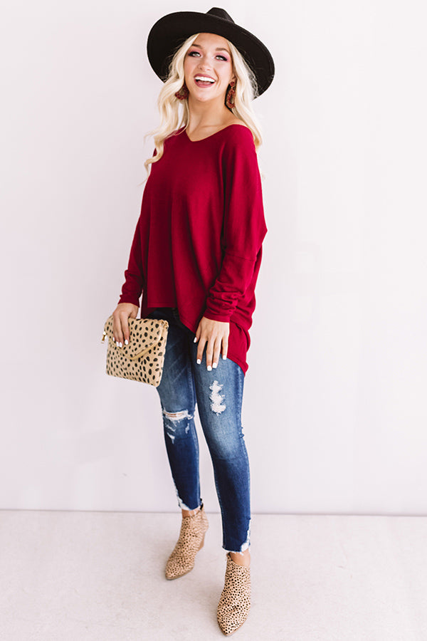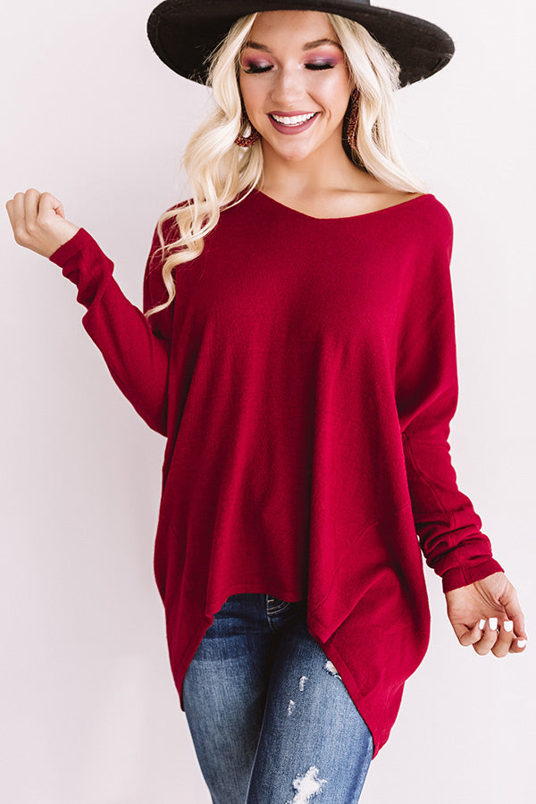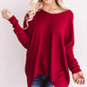 Bye warm weather...we'll miss you, maybe! Take in the beauty of the season while donning all your favorite hues in this crimson cotton sweater with its a relaxed v-cut neckline that can easily be taken off one shoulder, long fitted sleeves, and a relaxed bodice with a rounded high-low hem! This cozy transitional piece can be styled with frayed shorts, a crossbody, and neutral wedges for the summer or distressed pants, a faux suede hat, and a leopard bootie and clutch for the chilly fall weather! Measurements