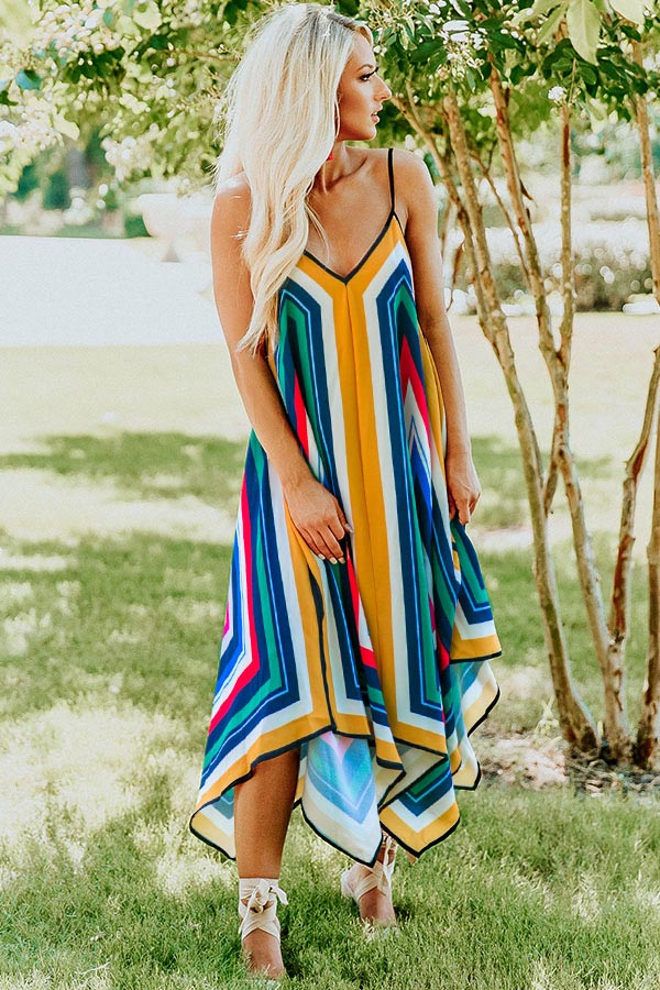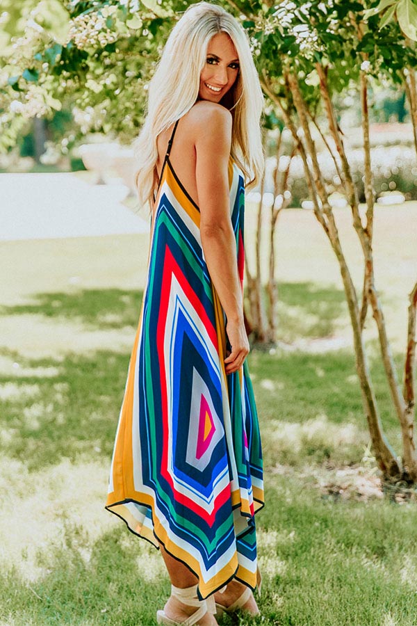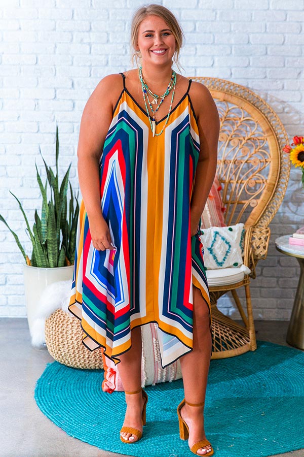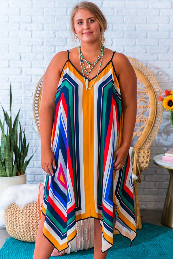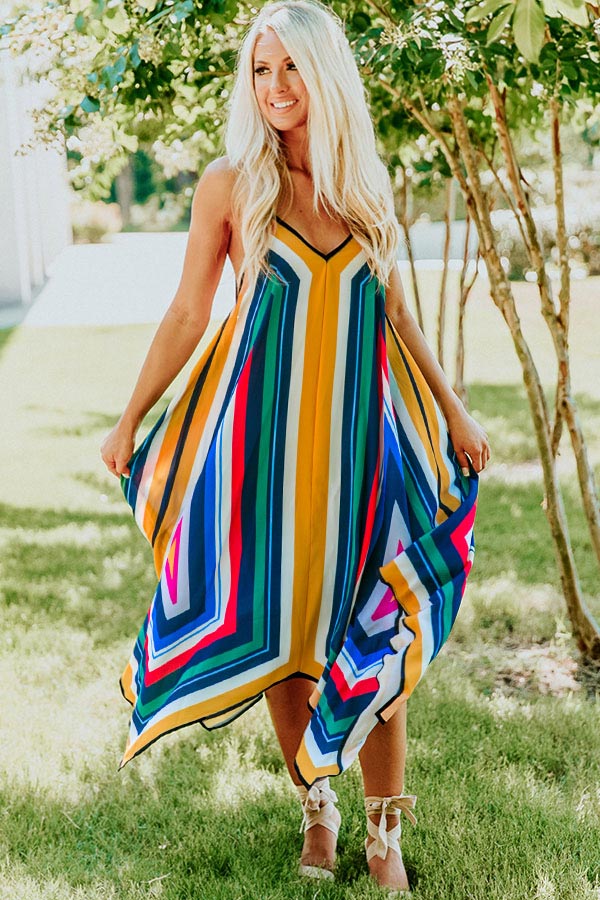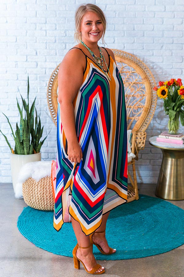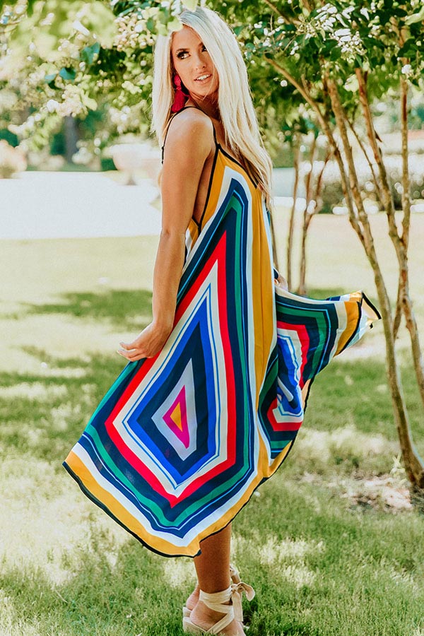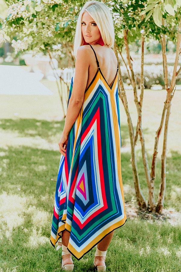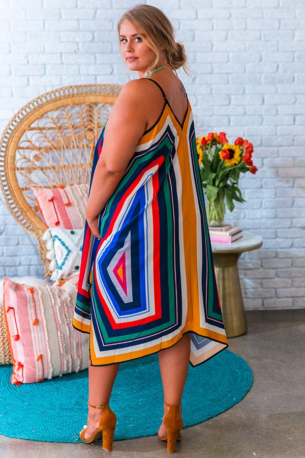 Peace, love & fabulous! The "Mod About You Dress" is the pop of color your closet has been begging for... And more! This groovy go-to dress has thin adjustable straps that fall into an ultra relaxed printed polyester silhouette with a handkerchief hem. Complete your look with a few colorful statement accessories & a block heel or wedge, for a glam & groovy look with retro vibes!