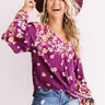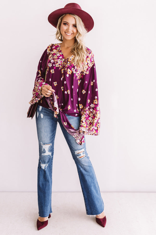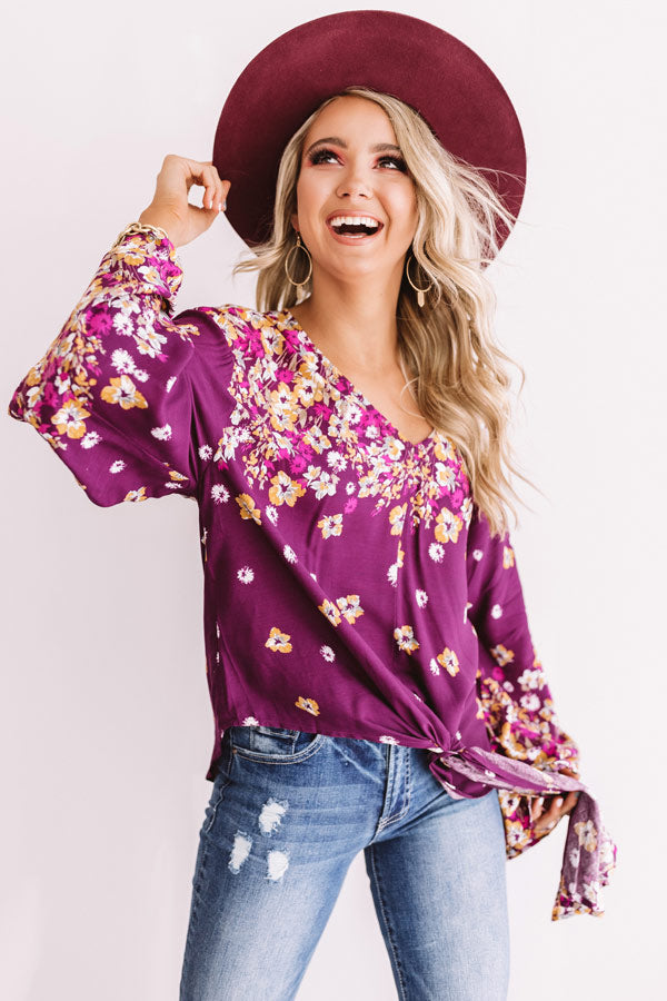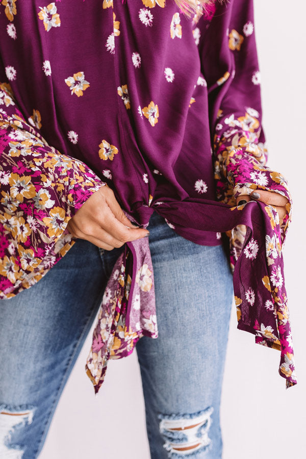 You are sure to look "mod in Montreal" when you wear this unique purple hued top featuring lightweight material, a bold floral pattern, a rounded v-cut neckline, long loose sleeves with flared cuffs, and an ultra relaxed bodice that falls into a tied front hemline and a rounded back hem! We have styled this piece with some distressed boot cut jeans and a merlot pump and faux suede hat, but you can also wear it with "The Essie Faux Suede Skirt in Camel," our "Cocktail Queen Earrings in Mustard," and "The Lynn Over The Knee Boot in Warm Taupe!" Measurements