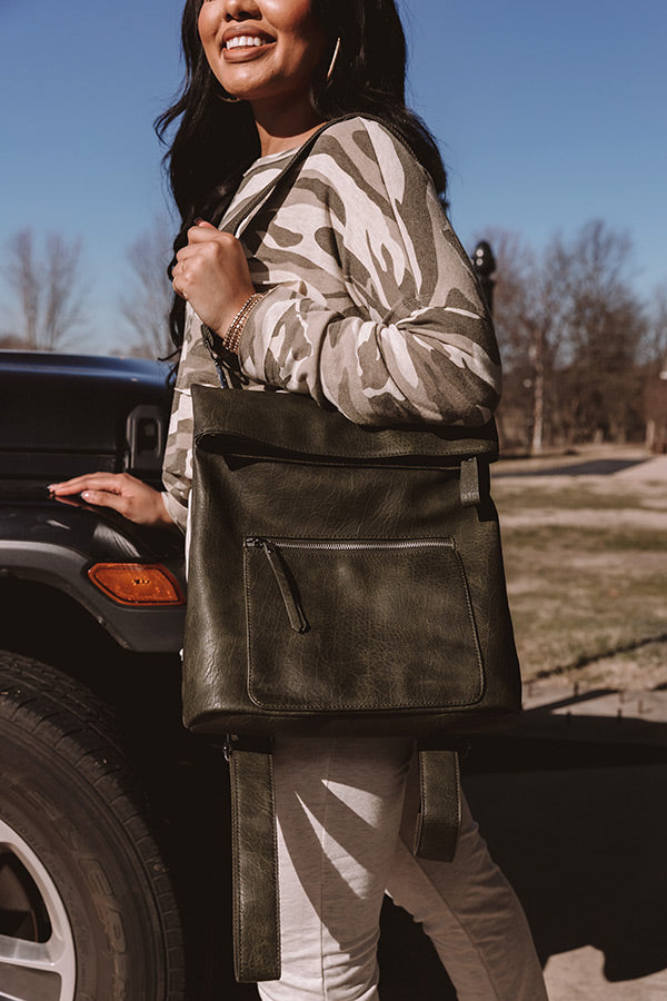 Strut around town in style with our trendy deep forest colored 'Mod Squad' backpack featuring sleek lightweight faux leather material, an outside zip closure pocket, a single handle, two adjustable shoulder straps, and a spacious fully lined pouch with a zip fold over cover and additional inside pockets!