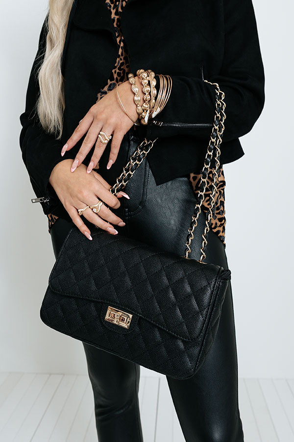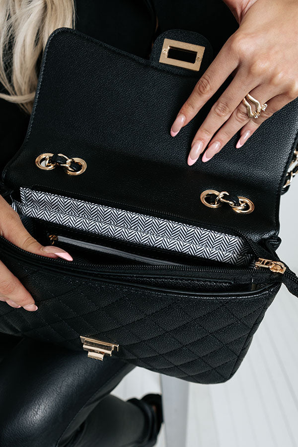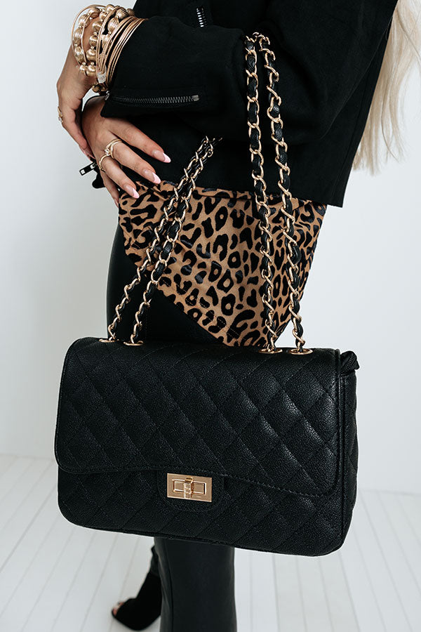 Add a pop of color to your OOTD with our chic black 'Mod Squad' tote featuring sleek lightweight material with quilted texturing, an adjustable gold chain link and ribbon shoulder strap, an outside pack pouch, and a spacious rectangular silhouette with a flap and twist closure and additional inside pockets and compartments!