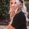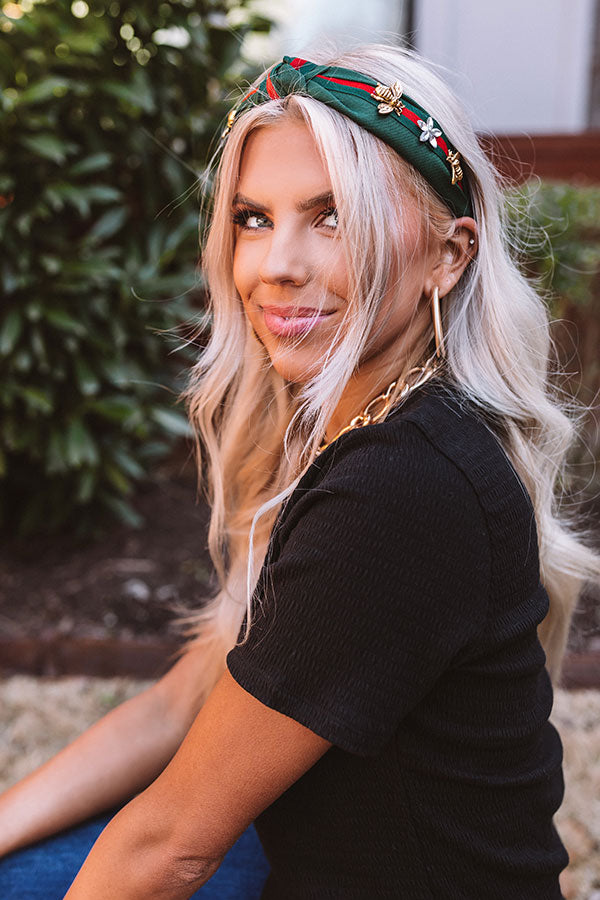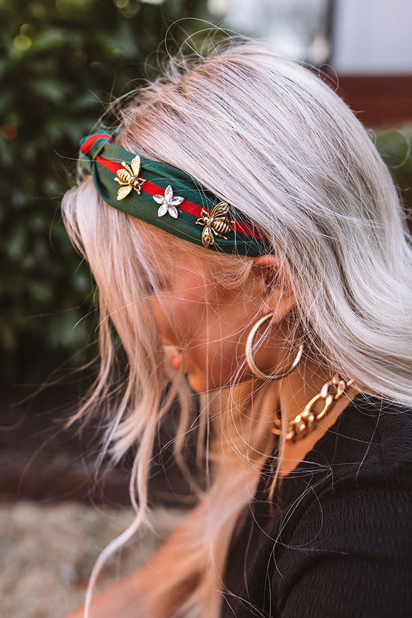 Believe us when we tell you this luxe headband is a modern treasure with its chic dark green and red stripes, adorable gold bumble bee and rhinestone flower embellishing, and an accent top knot!