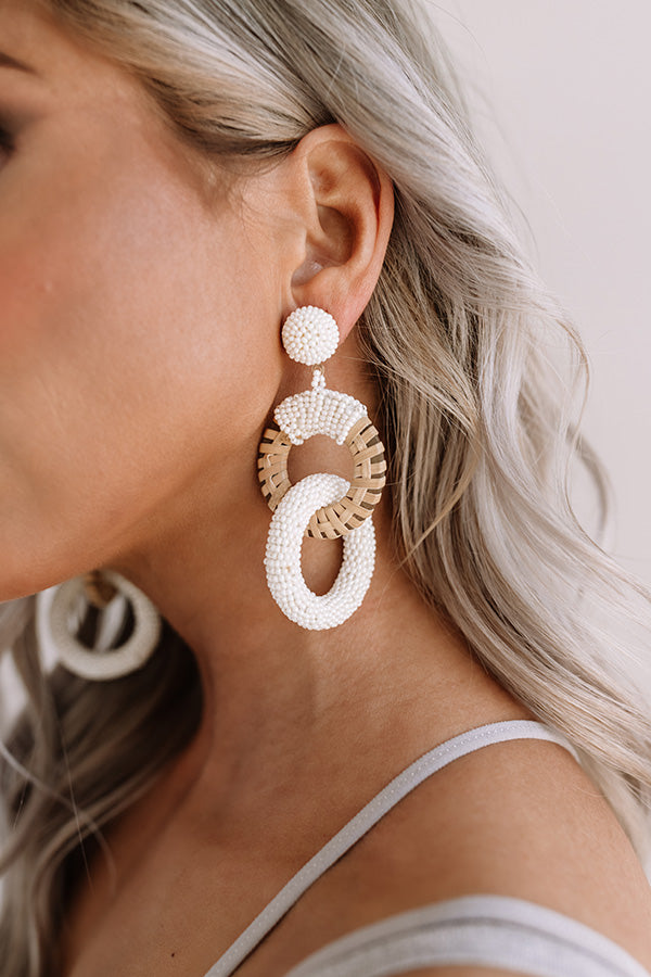 You are sure to stand out when you accessorize with our adorable "Mojito Bliss" statement earrings featuring beaded white half ball studs and dangling wooden hoops with interlocked white beaded hoops!