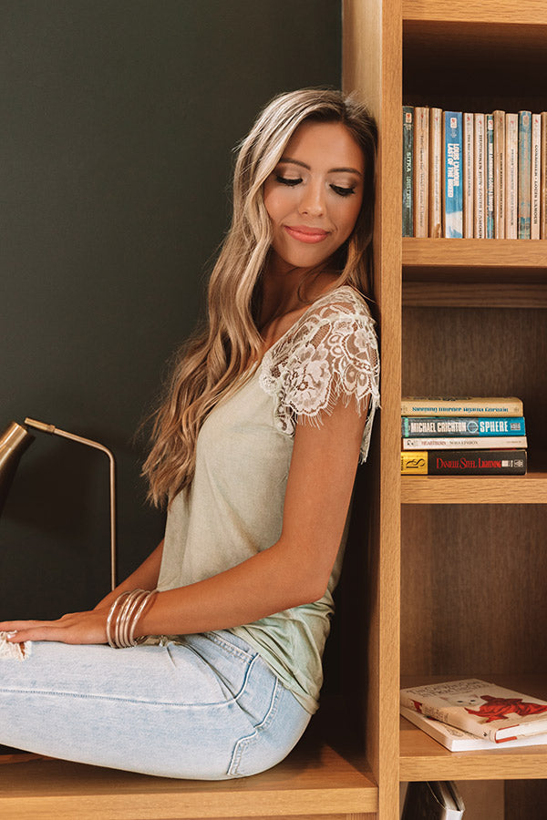 Keep your fashion standards high with our charming pear colored "Mojito Bliss" top featuring lightweight material, a scooped neckline and upper back with scalloped trim detailing, dainty intricate lace short sleeves, and a relaxed silhouette that falls into a straight hemline! You can style this adorable piece a variety of ways, like with some distressed ankle skinnies, but you can also wear it layered under our "Divine In Destin Knit Cardigan in Grey" with some frayed black shorts, "The Seraphina Faux Leather Wedge in Grey," and our "Travel Abroad Faux Leather Crossbody in Black!" Measurements