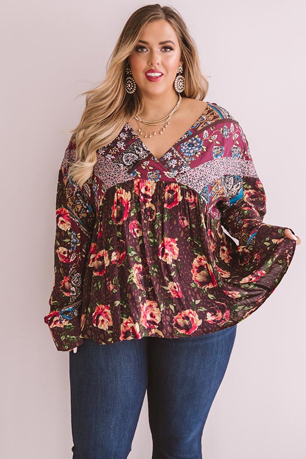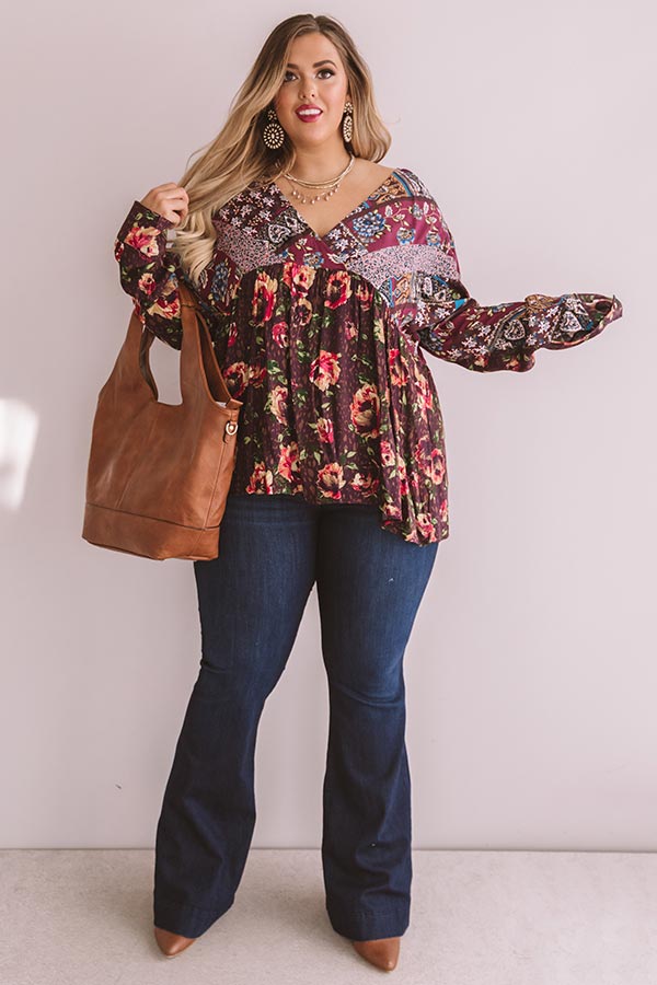 Plus Size - You are sure to feel a "moment of bliss" when you put on this dainty windsor wine colored shift top featuring lightweight material, a vibrant floral pattern, a wide v-cut neckline, long loose bishop sleeves with fitted elastic banded cuffs, and a relaxed silhouette that falls into a rounded hemline! We have styled this adorable piece with some dark wash flares and a brown bootie and tote, but you can also wear it with some distressed light wash ankle skinnies, "The Underwood Faux Leather Wedge in Dusty Purple," and our "Pass The Prosecco Wool Hat in Dark Khaki!"