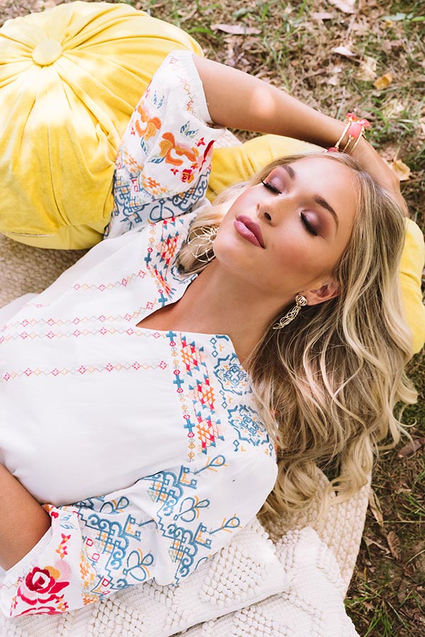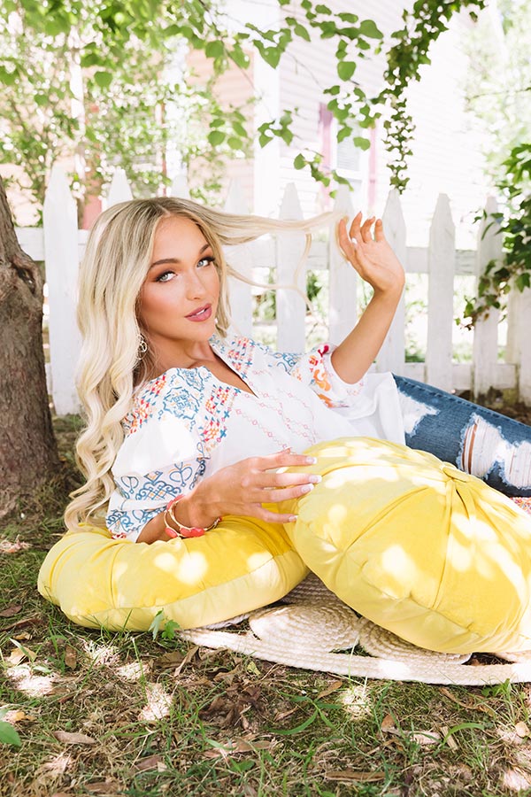 Life's a party, so dress like it in our lively "Monaco Bay" top featuring lightweight material patterned with intricate and colorful embroidered detailing, a high rounded neckline with an accent v-notch, loose bubble half sleeves with fitted elastic banded cuffs, and a relaxed silhouette that falls into a rounded hemline! We have styled this eye-catching piece with some dark wash flares, brown block heels, and a matching beaded clutch, but you can also wear it with some distressed denim shorts, "The Lyla Sandal in Hot Pink," and our "Glimpse Of Gorgeous Embellished Headband in Sky Blue!" Measurements