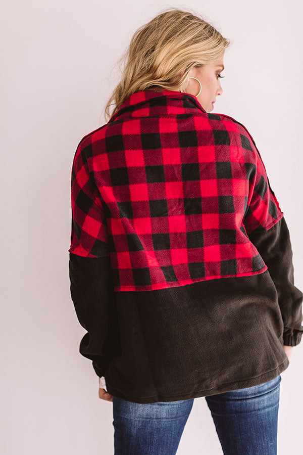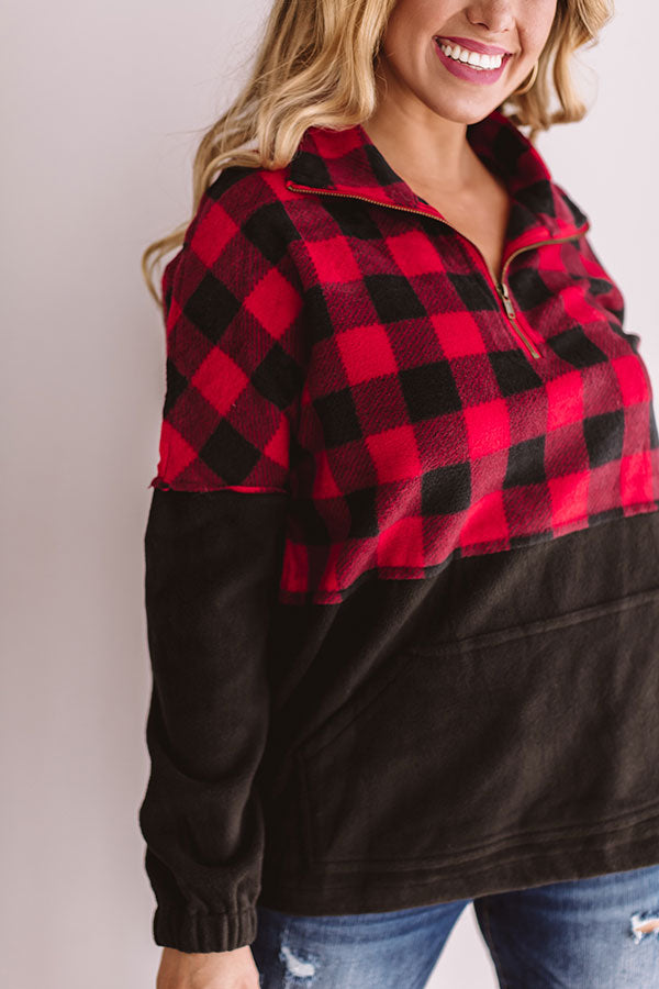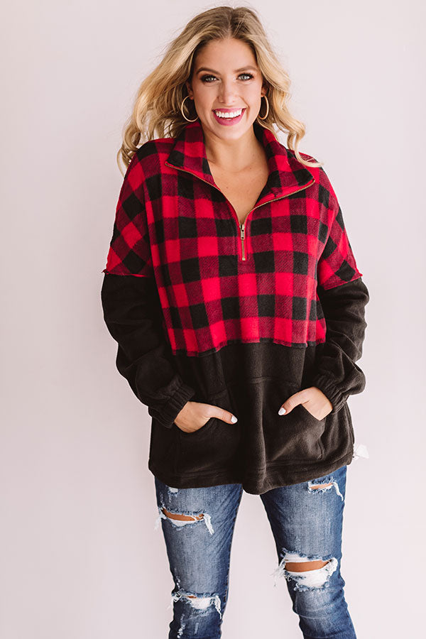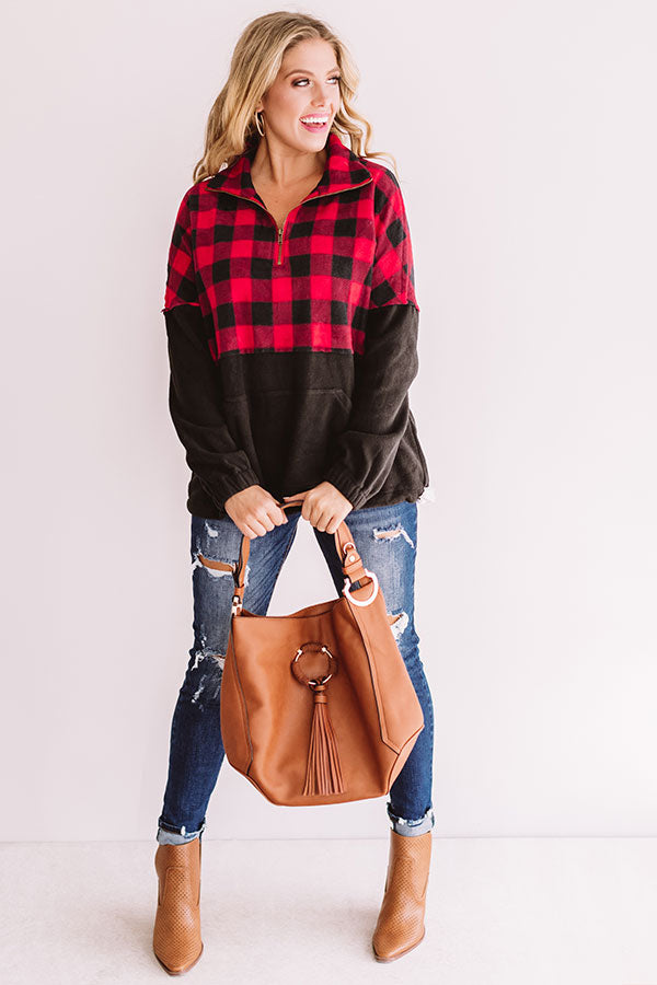 Keep warm when headed to get those "Monday espressos" with this red and black plaid pullover featuring a zip up v-neck, a high collar, long sleeves with elastic cuffs, a large front pocket pouch, thick fleece material, and a drawstring hemline! This cozy top can be styled with distressed jeans and a neutral bootie and tote, or you can swap the booties for "The Oakley Knee High Boot in Black" and switch the tote with our black "Cabin Vibes Knit Beanie" for multiple chilly weather looks! Measurements