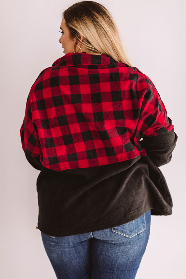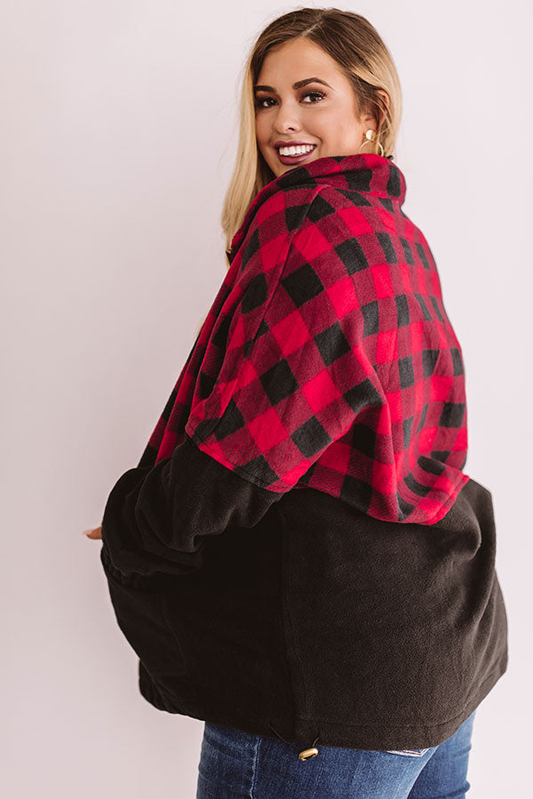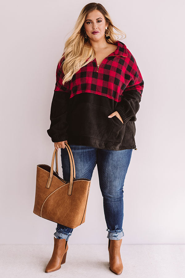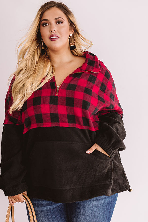 Plus Size - Keep warm when headed to get those "Monday espressos" with this red and black plaid pullover featuring a zip up v-neck, a high collar, long sleeves with elastic cuffs, a large front pocket pouch, thick fleece material, and a drawstring hemline! This cozy top can be styled with cuffed jeans and a neutral bootie and tote, or you can swap the booties for "The Oakley Knee High Boot in Black" and switch the tote with our black "Cabin Vibes Knit Beanie" for multiple chilly weather looks! Measurements