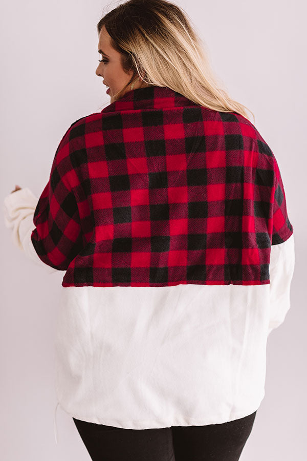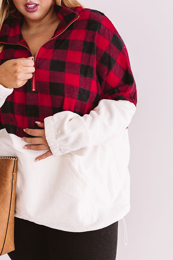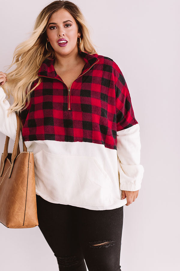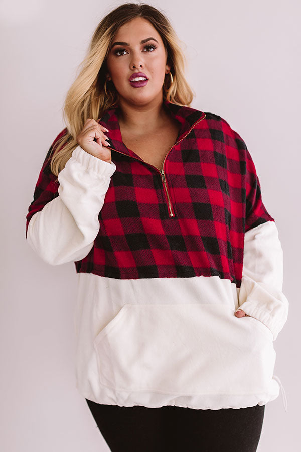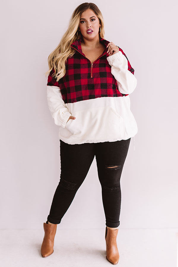 Plus Size - Keep warm when headed to get those "Monday espressos" with this red, cream, and black plaid pullover featuring a zip up v-neck, a high collar, long sleeves with elastic cuffs, a large front pocket pouch, thick fleece material, and a drawstring hemline! This cozy top can be styled with black skinnies and a neutral bootie and tote, or you can swap the booties for "The Haven Faux Suede Knee High Boot in Dark Grey" and switch the tote with our "Starry Skies Knit Beanie in Grey" for multiple chilly weather looks! Measurements