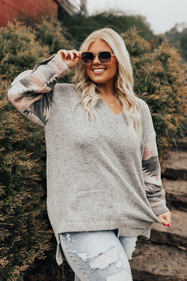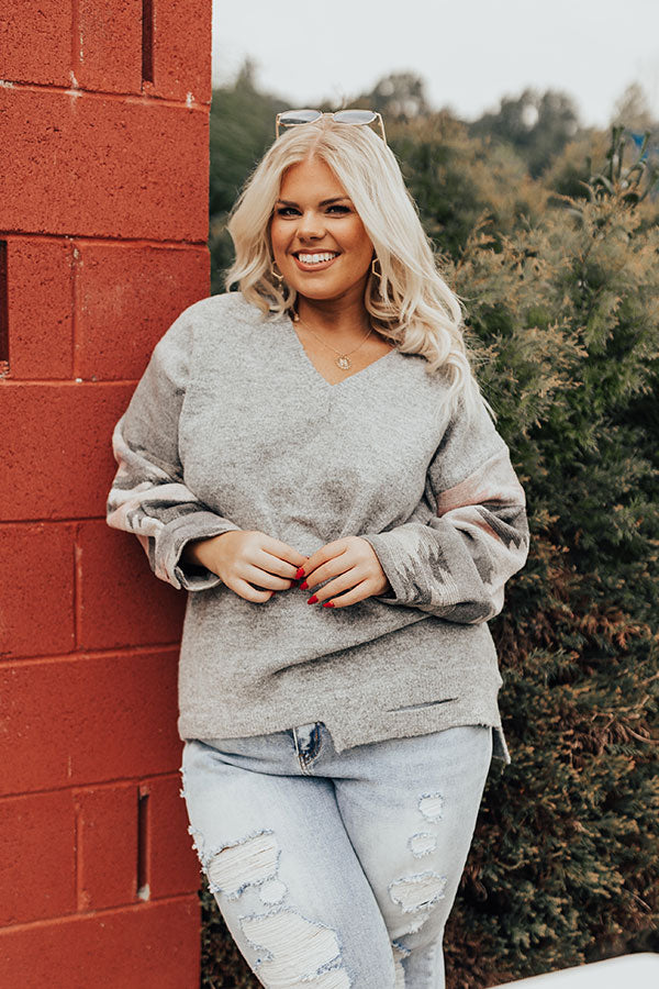Plus Size - - Keep cozy in our adorable grey 'Montana On My Mind Sweater' featuring soft tight knit material, a v-cut neckline, long loose sleeves with button closure cuffs and patterned with a blush and tan hued aztec print, and a slouched silhouette that falls into a straight hemline with distressed detailing!