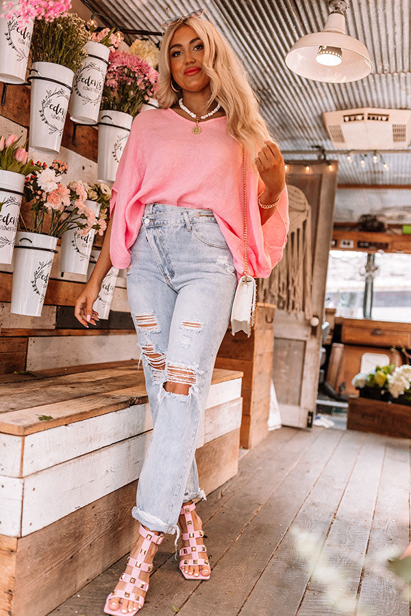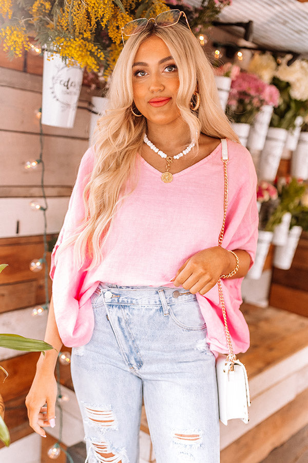 No matter your mood, this chic pink shift top is perfect for every occasion with its lightweight linen-like material, a rounded neckline, oversized bat wing half sleeves, and a relaxed silhouette that falls into a rounded hemline!