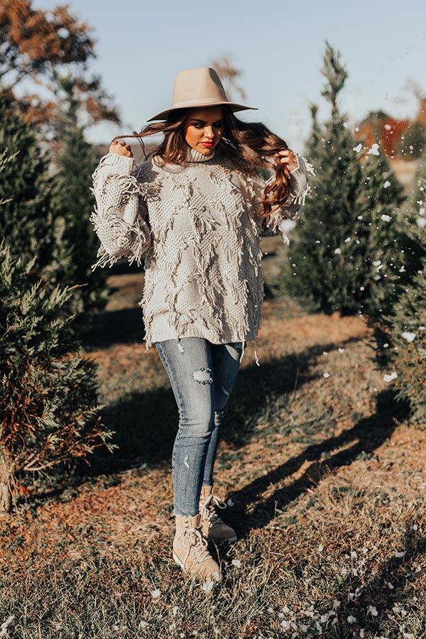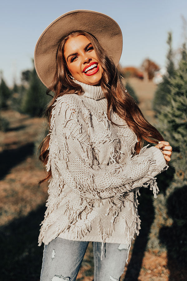 This adorable grey sweater is sure to be a mood booster with its soft and warm lightweight large knit material with fringed detailing, ribbed trim texturing, a rolled turtle neckline, long loose sleeves, and a slouched silhouette that ends in a straight hemline! Measurements