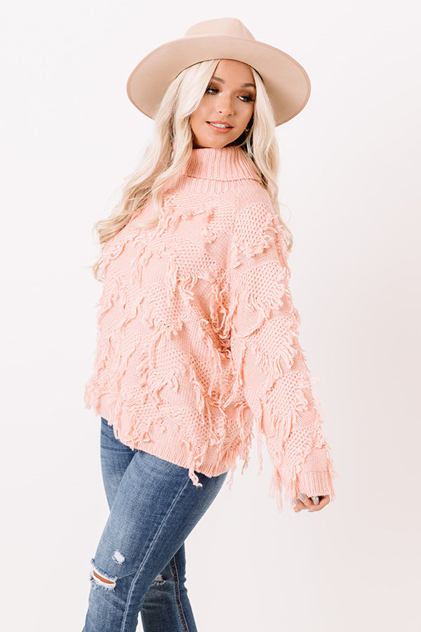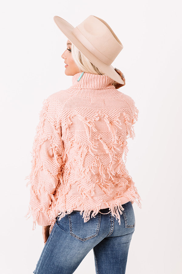 This adorable pink sweater is sure to be a mood booster with its soft and warm lightweight large knit material with fringed detailing, ribbed trim texturing, a rolled turtle neckline, long loose sleeves, and a slouched silhouette that ends in a straight hemline!