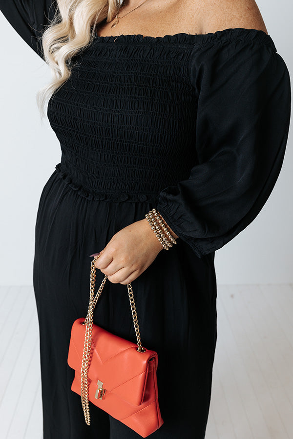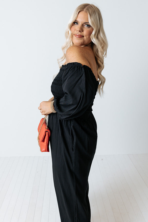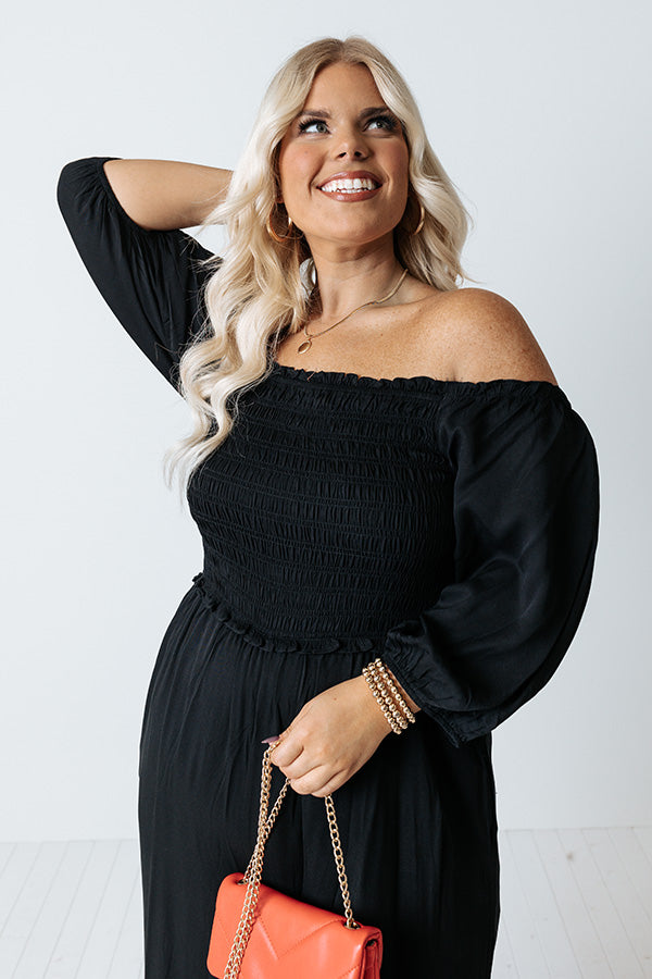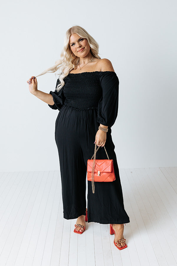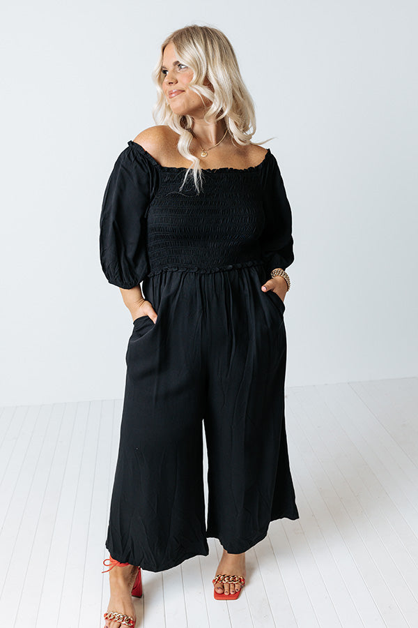 Strike a pose in our flirty photo-worthy plus size black 'Moon Phase' jumpsuit featuring lightweight flowy material, a flattering smocked bodice with a straight off-shoulder neckline, ruffle trim detailing and accent seams, half bubble drop sleeves, hidden side pockets, and a relaxed pants silhouette that falls into straight mid-calf length hemlines! Measurements