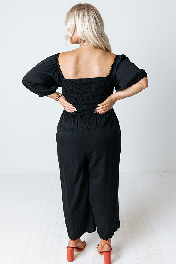 Moon Phase Smocked Jumpsuit In Black Curves