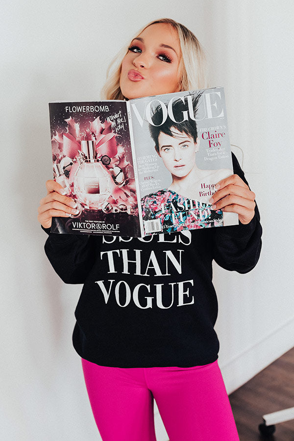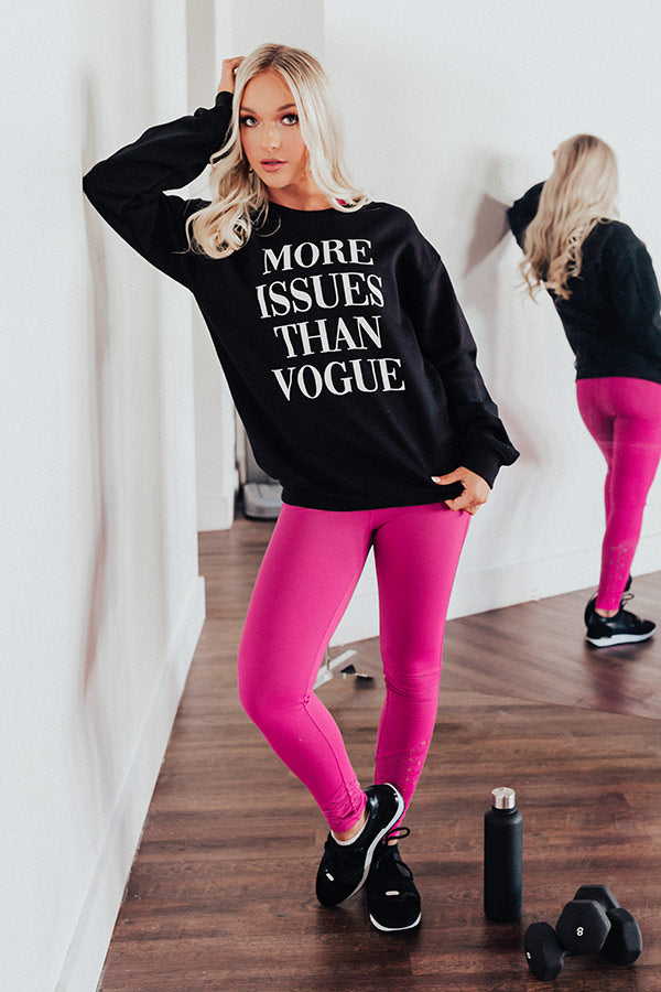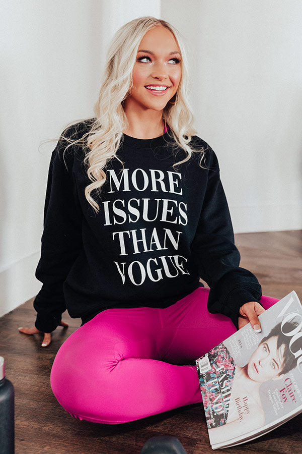 May your OOTD be comfy with our black "More Issues Than Vogue Sweatshirt" featuring soft and warm lightweight material, a high rounded neckline, long loose sleeves with fitted cuffs, adorable white lettering on the front, and a relaxed silhouette that falls into a straight hemline! You can wear this piece a variety of ways, like dressed down with some hot pink leggings and trendy black sneakers, or styled up with some distressed light wash ankle skinnies, "The Karlie Perforated Bootie in Blush," a faux suede backpack, and our "All Caught Up Headband in Blush!"