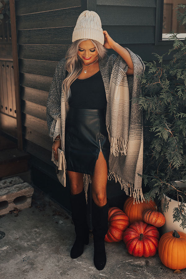 Hop your morning flight in style and comfort with this adorable charcoal colored poncho featuring soft material with an ombre stripe pattern, oversized batwing sleeves, and an ultra draped silhouette that falls into a straight mid-thigh length hemline with fringe trim detailing! Measurements