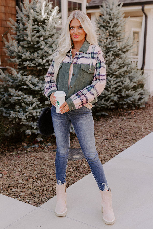 The perfect fall outerwear piece, our trendy iced latte colored 'Morning In The Mountains' jacket features plaid and forest colored corduroy color block material, a button down front with a collared neckline, long loose sleeves with button closure cuffs, two accent chest pockets with flap closures, and a relaxed silhouette that ends in a straight hemline!