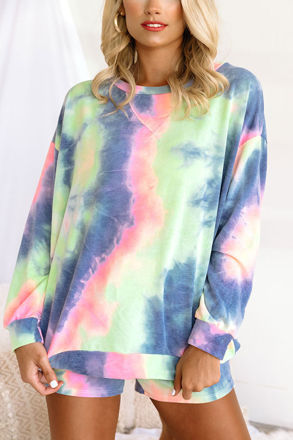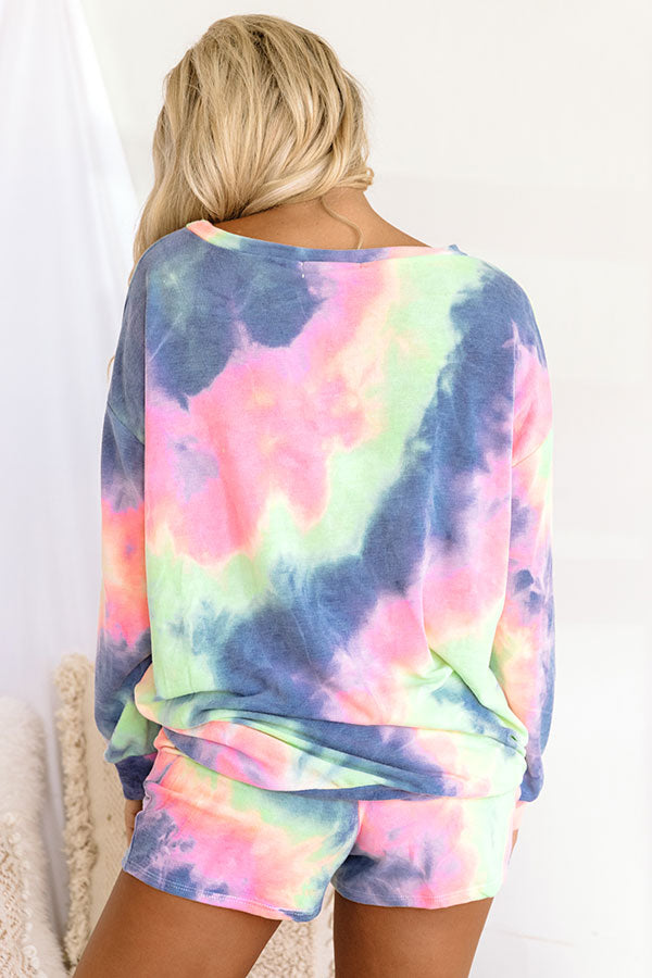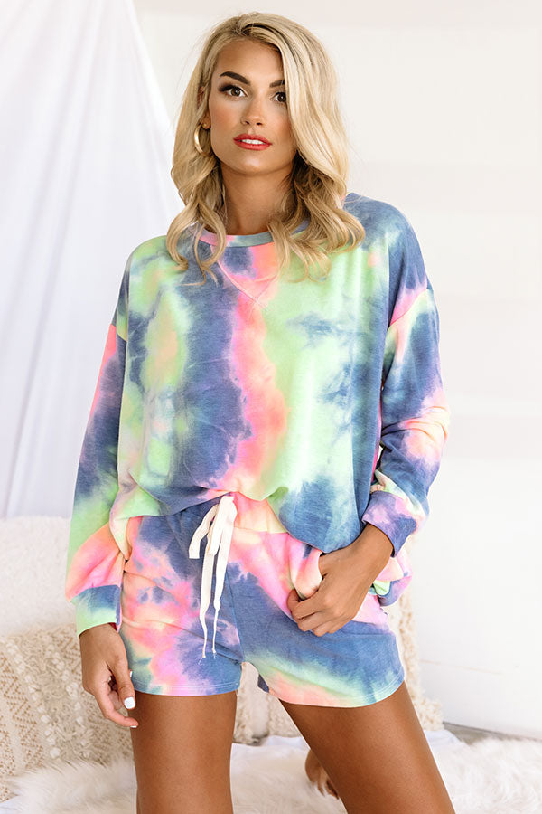 There is no better piece to wear during your "morning routine" than this adorable shift top featuring ultra soft lightweight material patterned with navy, pink, and lime green hued tie dye, a high rounded neckline, long loose sleeves with fitted cuffs, and a relaxed silhouette that falls into a straight hemline! This comfy piece styles perfectly with our matching "Morning Routing Tie Dye Shorts in Navy," a scrunchie, and some fuzzy slippers for the ultimate two-piece lounge look!