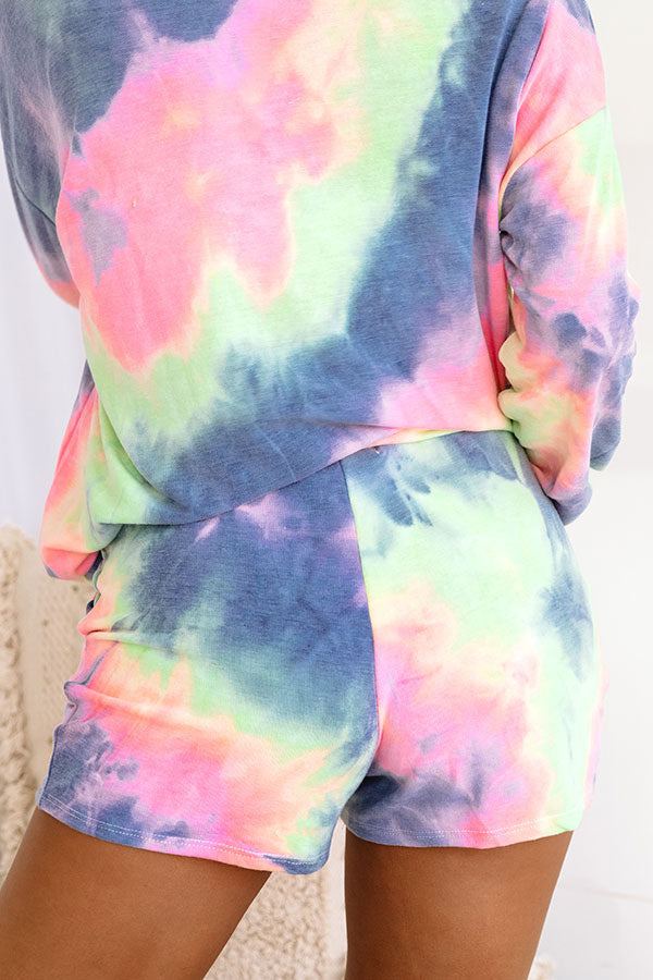 There is no better piece to wear during your "morning routine" than these adorable shorts featuring ultra soft lightweight material patterned with navy, pink, and lime green hued tie dye, an elastic waistline with a tie belt, accent side pockets, and a relaxed silhouette that falls into straight upper-thigh length hemlines! This comfy piece styles perfectly with our matching "Morning Routing Tie Dye Shift Top in Navy," a scrunchie, and some fuzzy slippers for the ultimate two-piece lounge look!