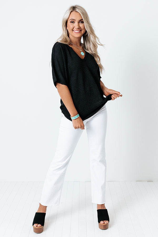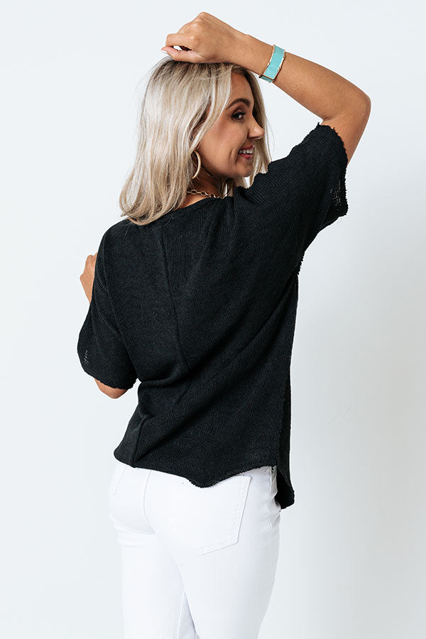 Spend your morning in cute comfort with this simple black shift top featuring soft lightweight tight knit material, a scooped neckline, short loose sleeves, and a slouched silhouette that ends in a straight hemline! Measurements
