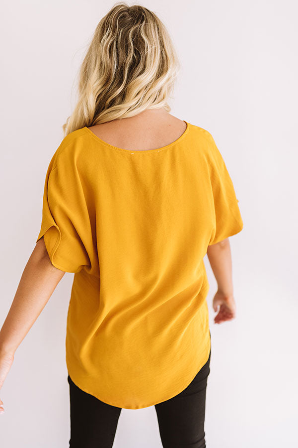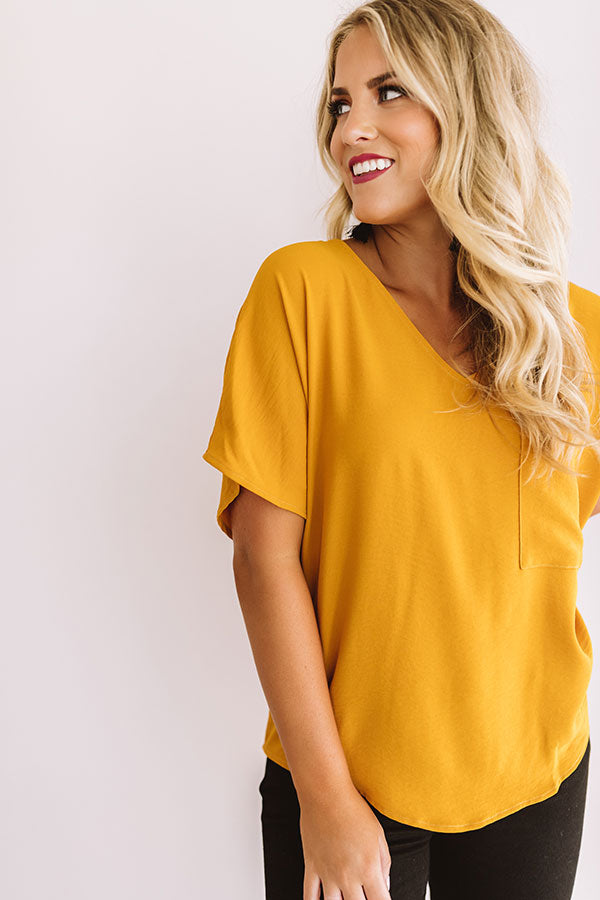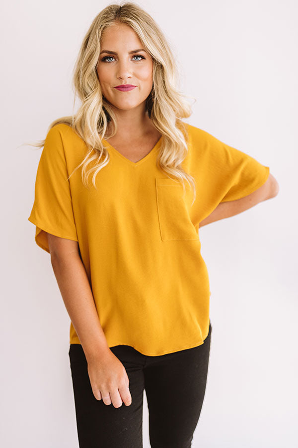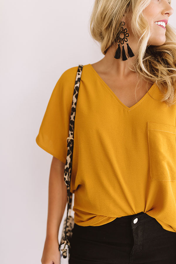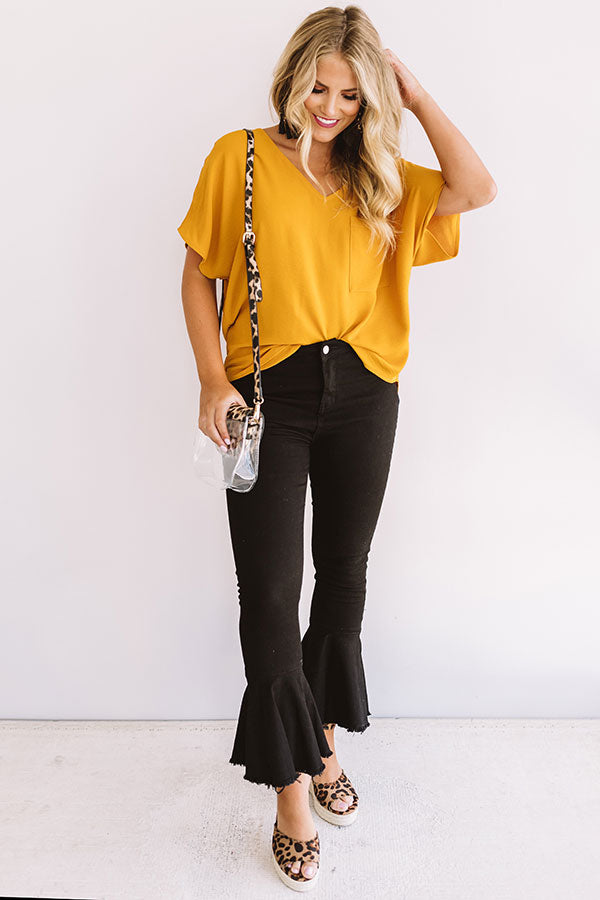 Show up to game day in style with the "Moroccan Moment Shift Top In Golden Honey" adorned with a v-neck, flowy short sleeves, a loose bodice, lightweight material, and a rounded back hem and straight front hem that can be tucked in! We've paired it with black flares and a leopard wedge and transparent crossbody, but it can also be styled with "The Ruby High Waist Distressed Shorts" and "The Charlotte Espadrille in Yellow" for an OOTD that will stop the crowd in their tracks! Measurements