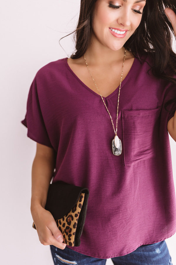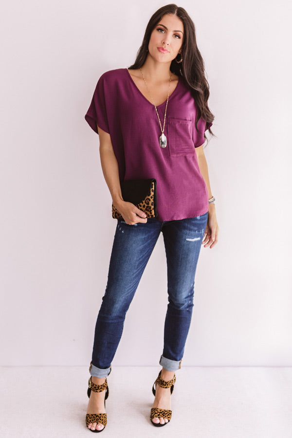 Show up to game day in style with the "Moroccan Moment Shift Top In Wine" adorned with a v-neck, flowy short sleeves, a loose bodice, lightweight material, and a rounded back hem and straight front hem that can be tucked in! We've paired it with white flares, black wedges, statement earrings, and a snake print transparent crossbody, but it can also be styled with "The Ruby High Waist Distressed Shorts" and "The Camden Sneaker in Wine" for an OOTD that will stop the crowd in their tracks! Measurements