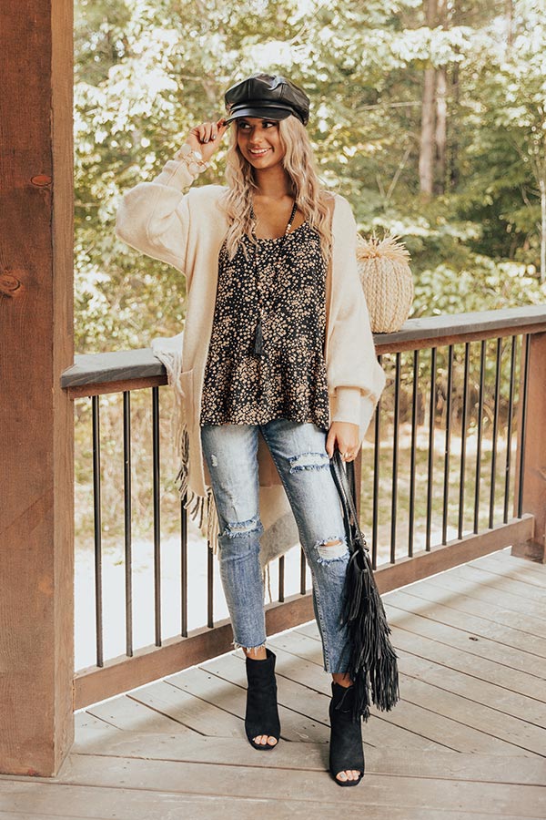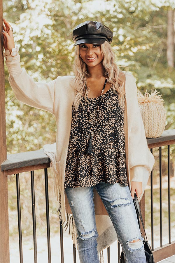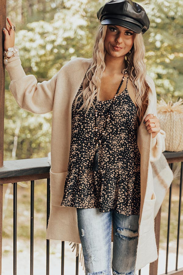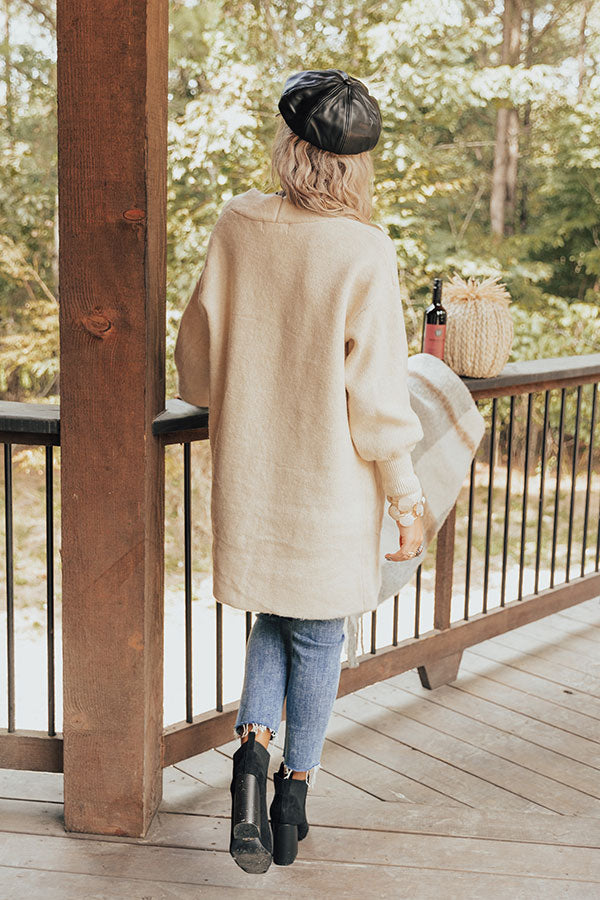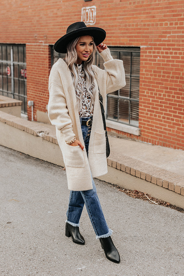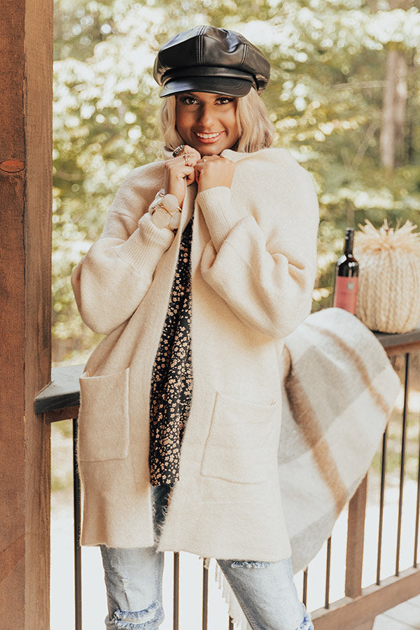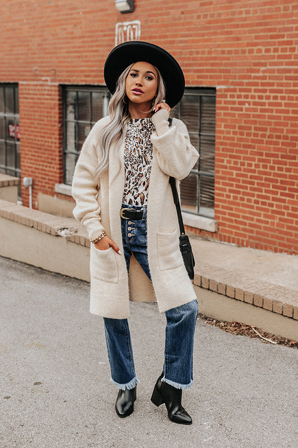 We have no doubt you will most likely fall in love with this cute cream hued cardigan featuring soft knit material, long oversized sleeves with fitted, low accent pockets, and a draped open front silhouette that falls into a straight mid-thigh length hemline!
