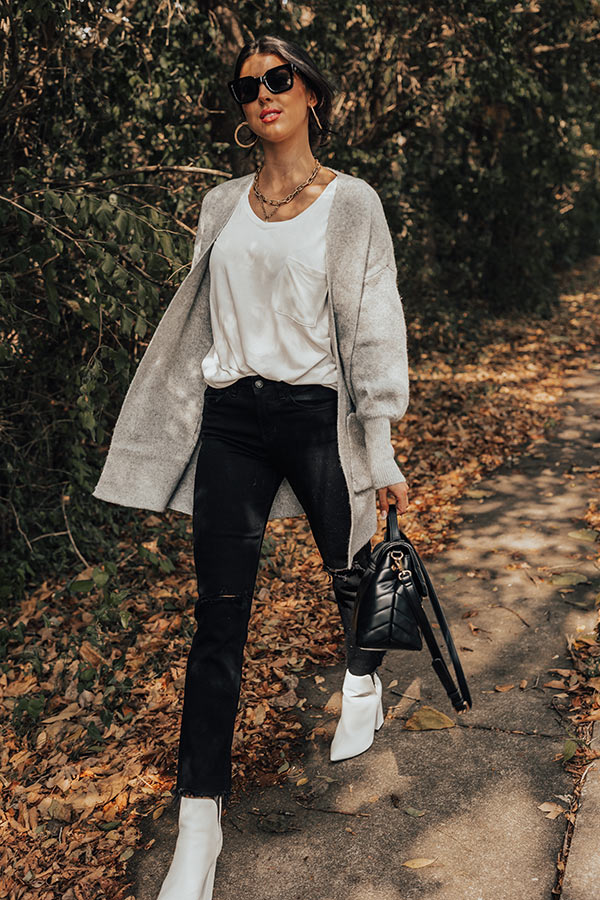 We have no doubt you will most likely fall in love with this cute grey hued cardigan featuring soft knit material, long oversized sleeves with fitted, low accent pockets, and a draped open front silhouette that falls into a straight mid-thigh length hemline.