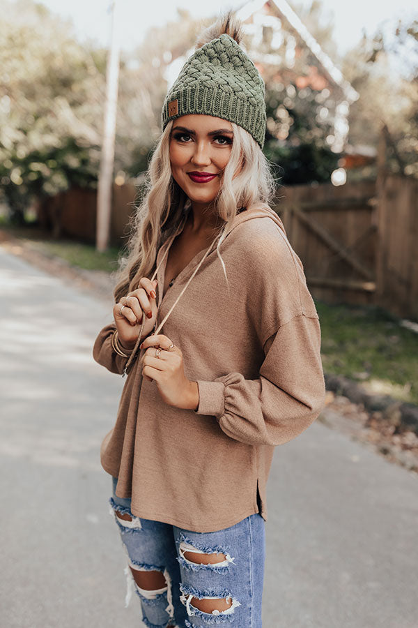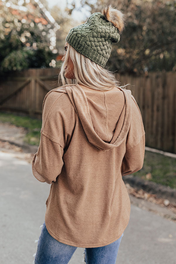 Stay warm when you're "mountain bound" with this casual cute mocha colored hoodie featuring lightweight material, a button up bodice with a high rounded neckline with a drawstring hooded back, long loose sleeves with fitted cuffs, and a relaxed silhouette that falls into a rounded hemline with accent side slits! Measurements
