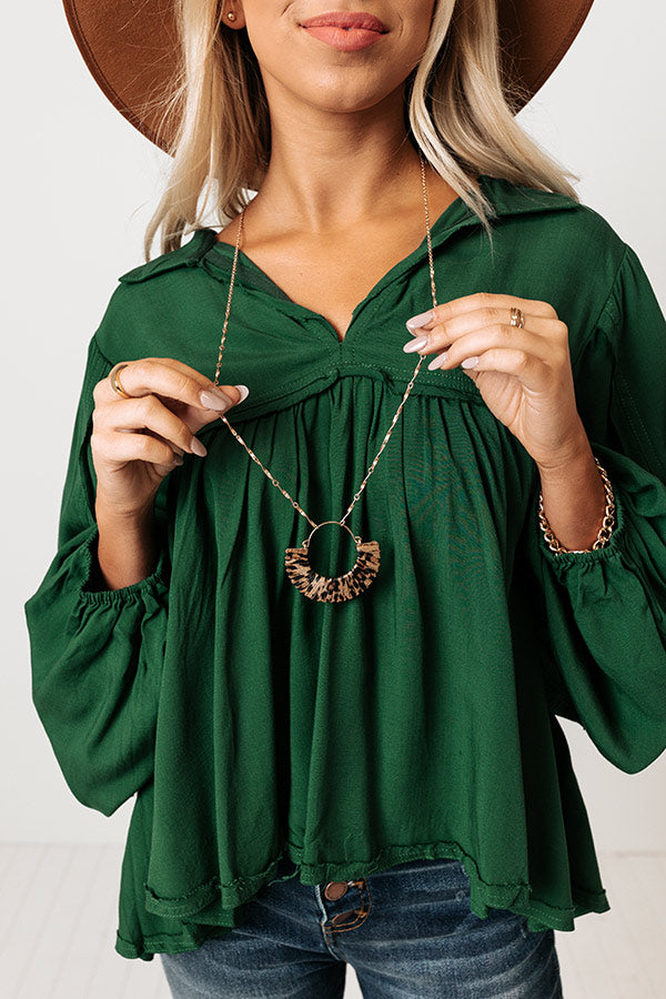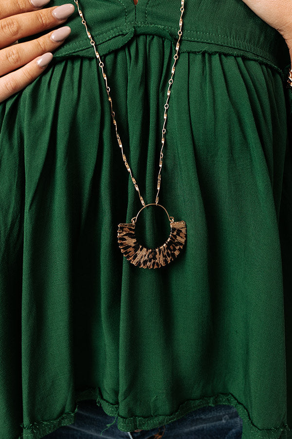 Make a charming statement with our cute 'Mountain Ranch Necklace' featuring a long gold link chain with tiny bead details and a dainty hoop with a woven leopard print fan accent!