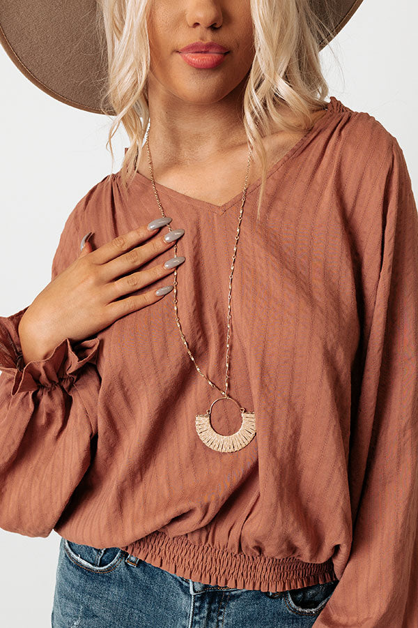 Make a charming statement with our cute 'Mountain Ranch Necklace' featuring a long gold link chain with tiny bead details and a dainty hoop with a woven warm taupe fan accent!
