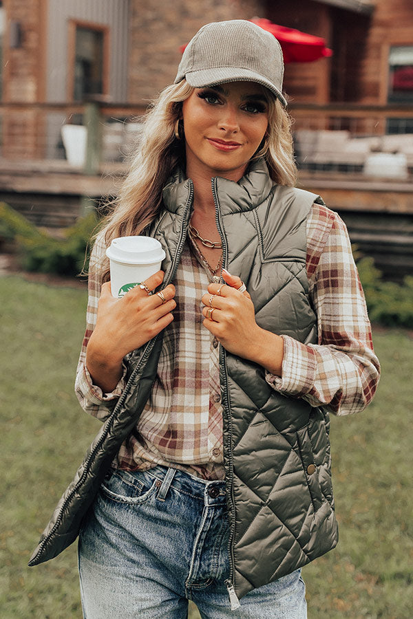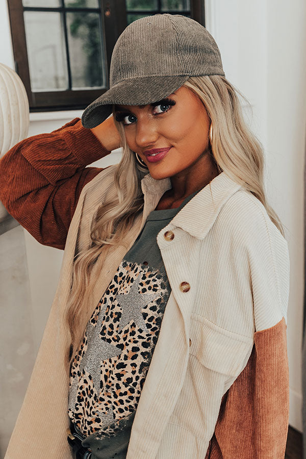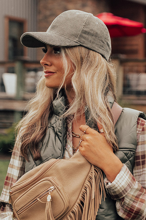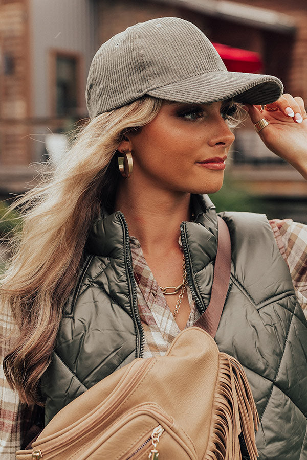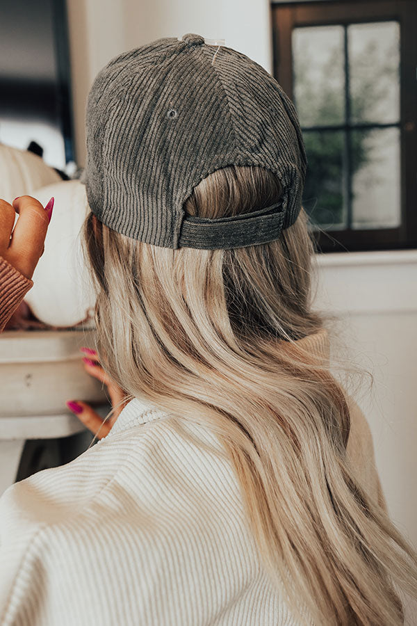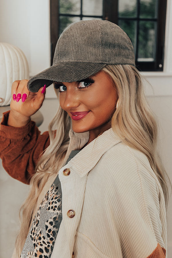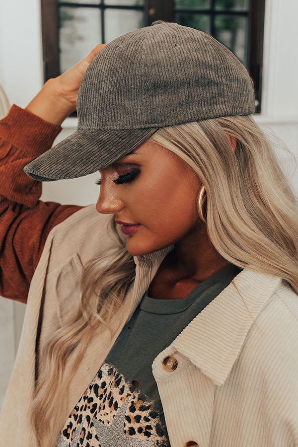 Stay casual in our olive colored 'Mountainside Sips' baseball cap featuring corduroy material, a rounded bill, and an adjustable back!