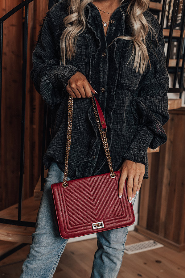 Complete your office look with our chic 'Moves To Make' crossbody. Features sleek faux leather in a wine color, quilted texturing, chain link shoulder strap, a flap with twist closure, gold hardware, and a spacious fully lined rectangular pouch with zip closure, one interior accessory pocket as well as an interior pocket with zip closure.