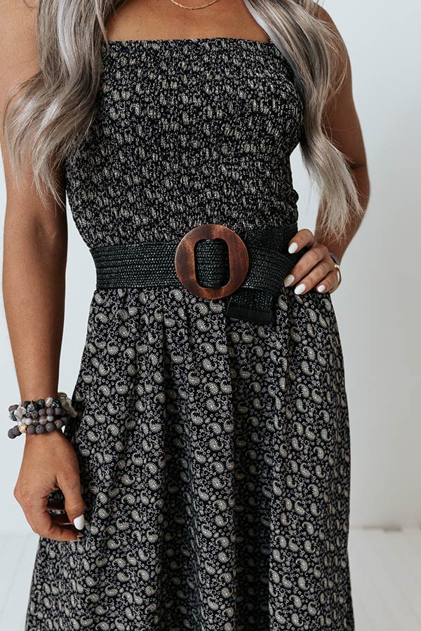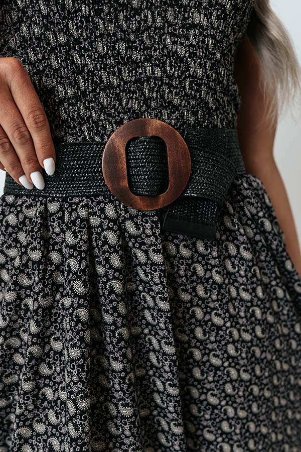 You are sure to look like a star when you complete your look with our adorable 'Movie Reel' belt featuring a wide black woven strap and a wooden circle buckle!
