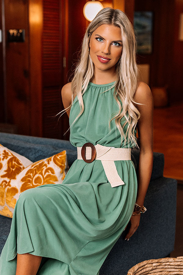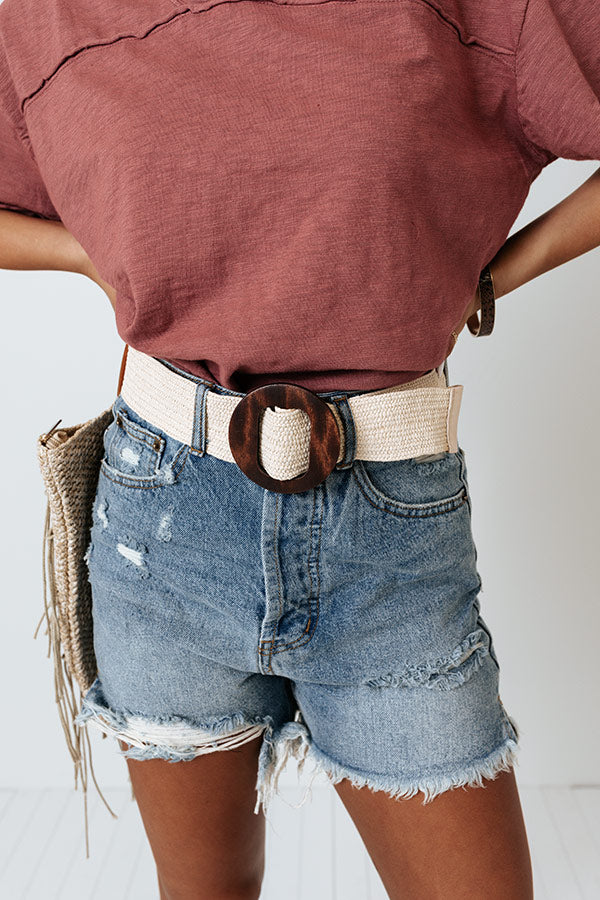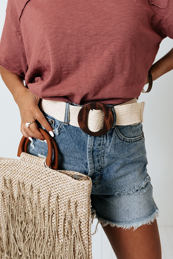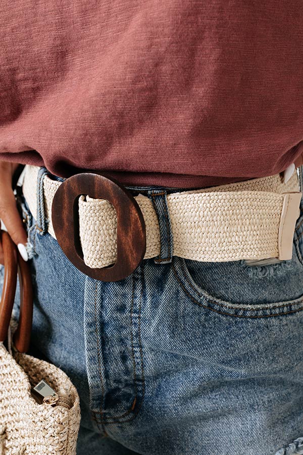 You are sure to look like a star when you complete your look with our adorable 'Movie Reel' belt featuring a wide cream woven strap and a wooden circle buckle!