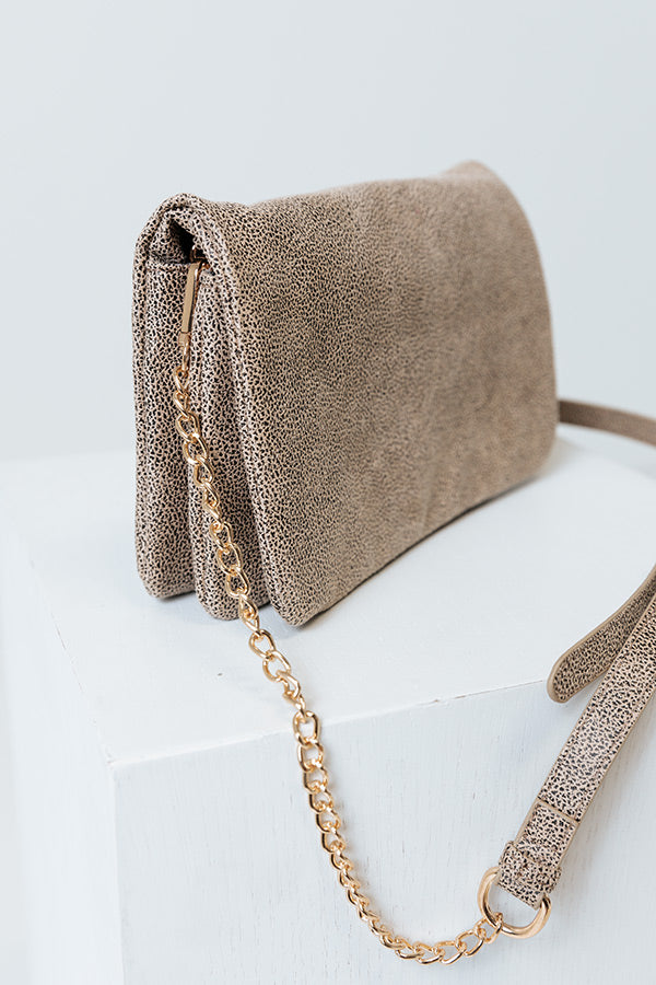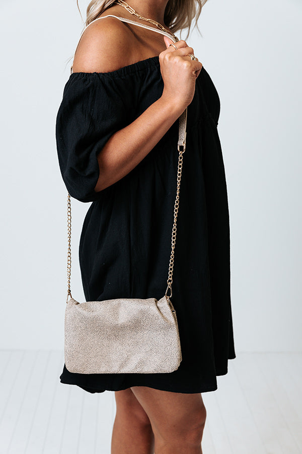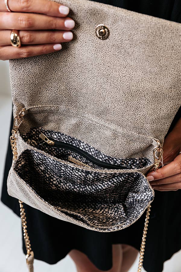 'Moving To The City Clutch' featuring lightweight material patterned with a tiny black spotted print, a flap closure with a snap button, a removable and adjustable chain link shoulder strap, and a spacious fully lined rectangular silhouette with additional inside compartments and pockets!