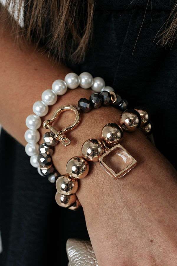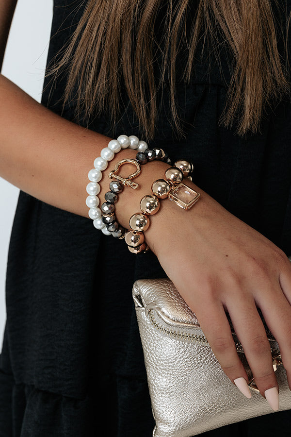Upgrade your arm candy with this darling bracelet set featuring three stretch pieces: a large gold beaded one with a clear square pendant, a grey beaded one with a horseshoe clasp, and a pearl one!