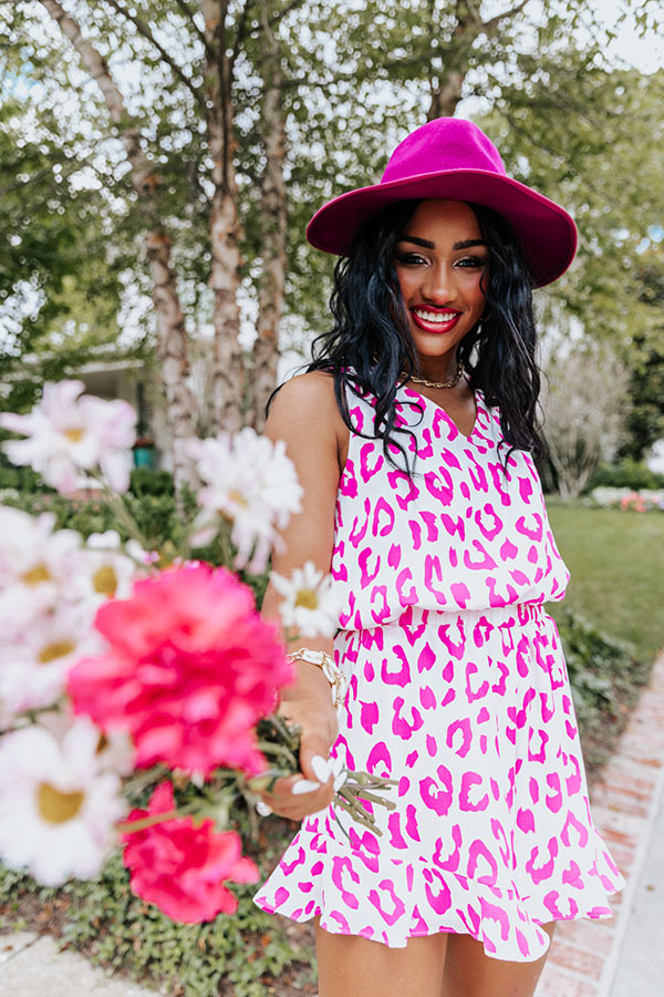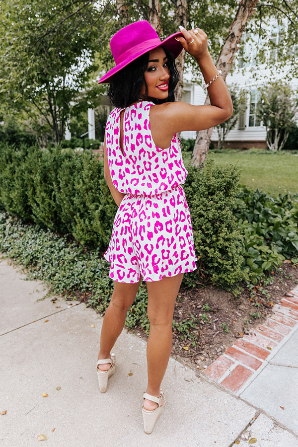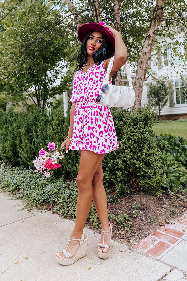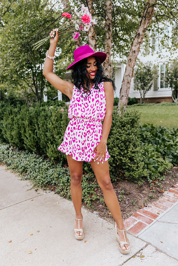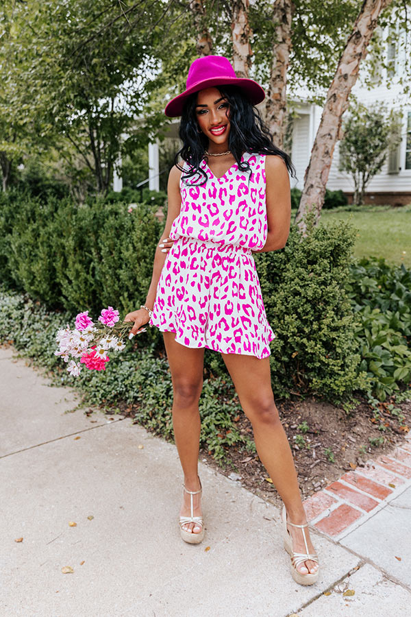 You will without a doubt look darling in this flirty white romper featuring lightweight breezy material patterned with a fuchsia leopard print, a v-cut neckline with wide shoulder straps, a cinched waistline with a draped bodice, accent side pockets, and a relaxed shorts silhouette that ends in ruffled upper-thigh length hemlines!