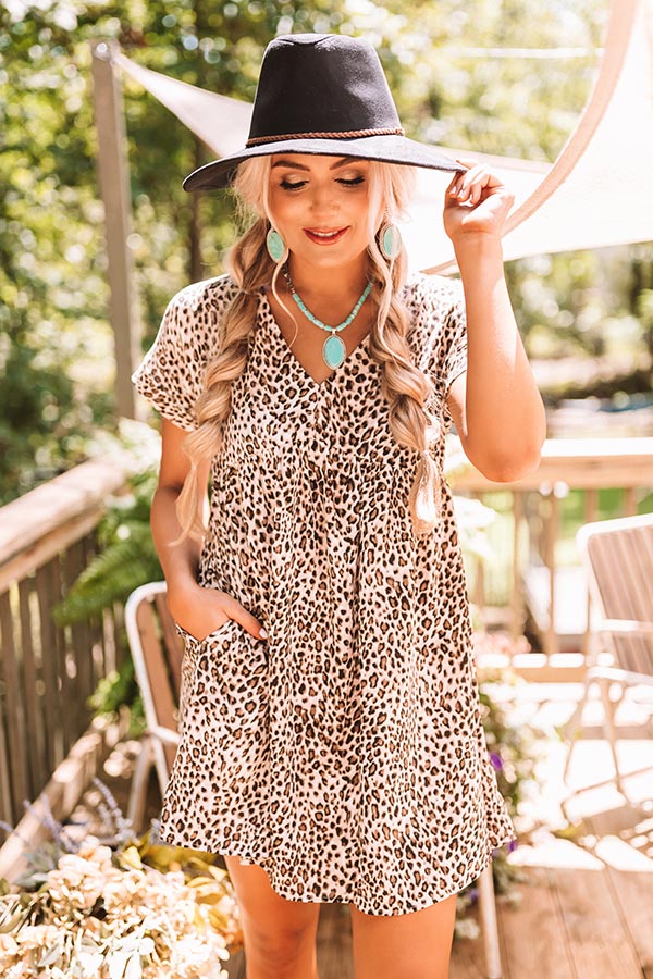 Show off your good side with this stunning dress featuring lightweight material patterned with a bold brown and black leopard print, a v-cut neckline, short loose sleeves, accent side pockets, and a relaxed tiered babydoll silhouette that falls into an uneven hemline! We have layered this cutie under a knit cardigan with a strappy black heel and wool hat, but you can also wear it with "The Franco Perforated Bootie in Brown!" Measurements