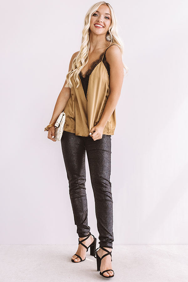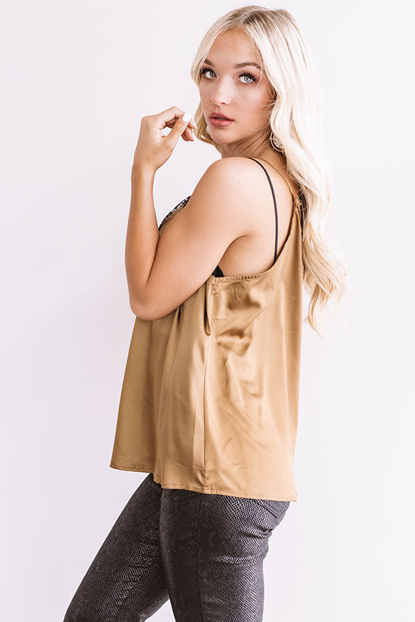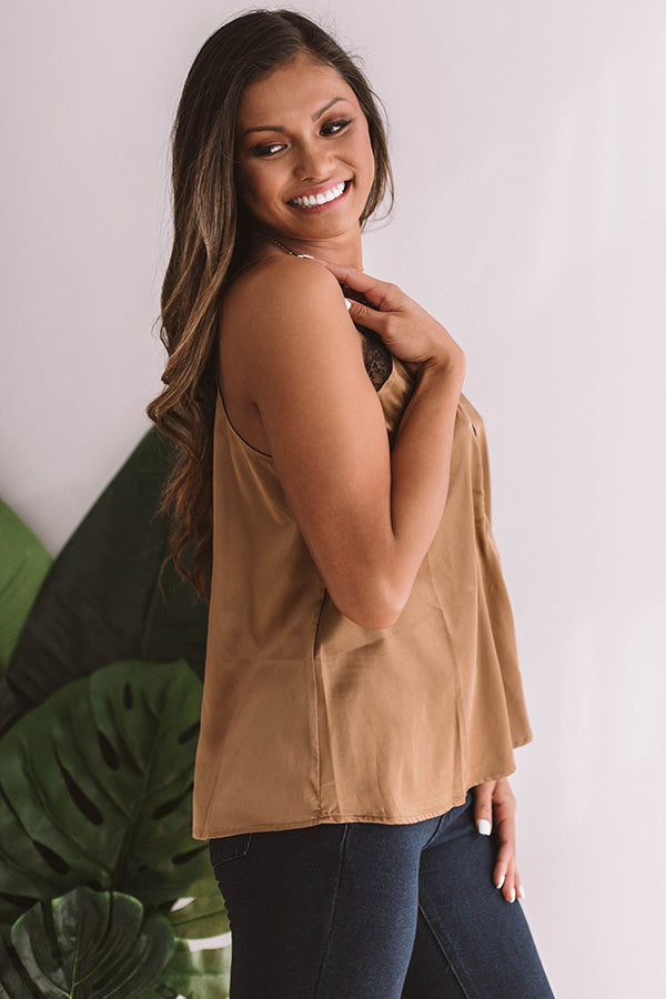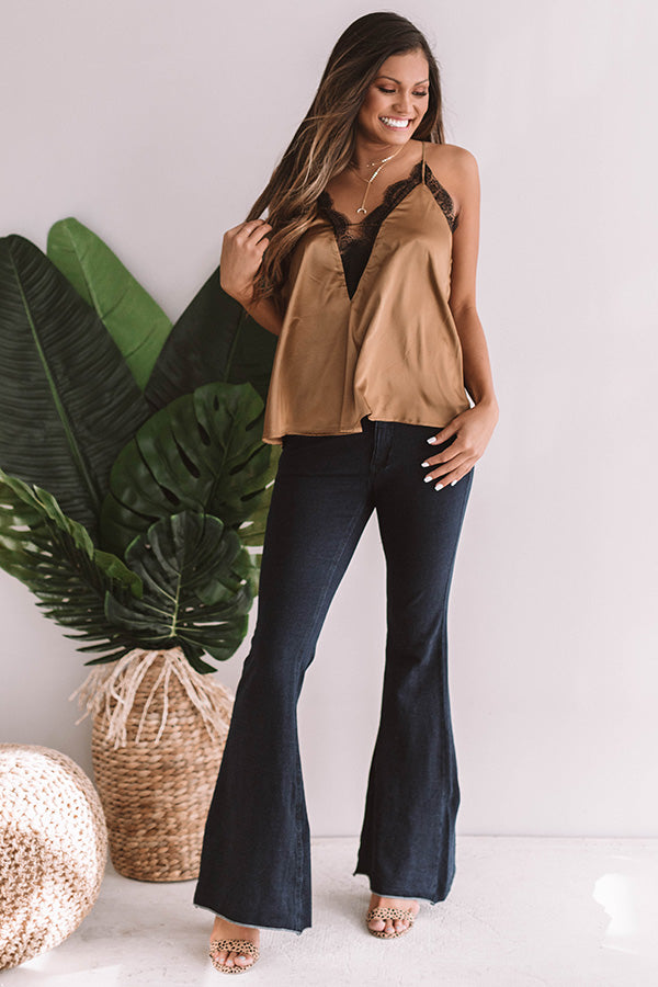 The chocolate colored "My Happy Place" tank is the upscale basic your closet has been asking for! It features lightweight satin material, a deep v-cut neckline, intricate black lace trim detailing, spaghetti straps that lead into a square racer back, and a breezy silhouette that falls into a straight hemline! This effortless year round piece can be styled a variety of ways, like solo with some black ankle skinnies and strappy heels, or layered under a jacket or cardigan with some flares or a skirt with a black peep toe bootie, tote, and faux suede hat! Measurements