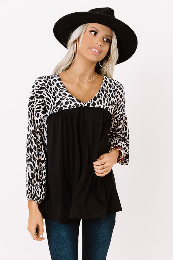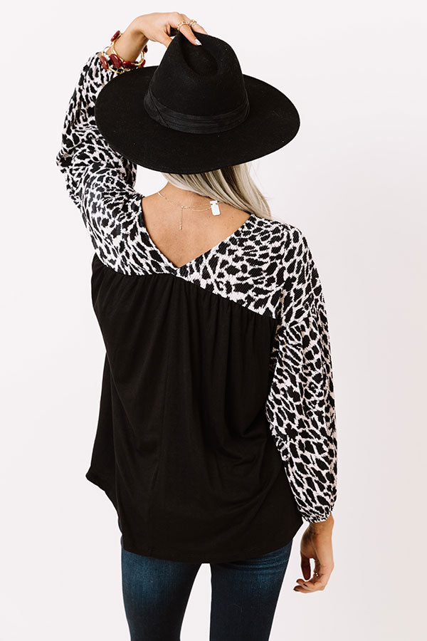 We have no doubt you will want to wear this chic black top to your hearts delight with its lightweight flowy material, a v-cut neckline and upper back, a bold leopard print across the shoulders and down the long loose sleeves, and a relaxed silhouette that falls into a straight hemline!